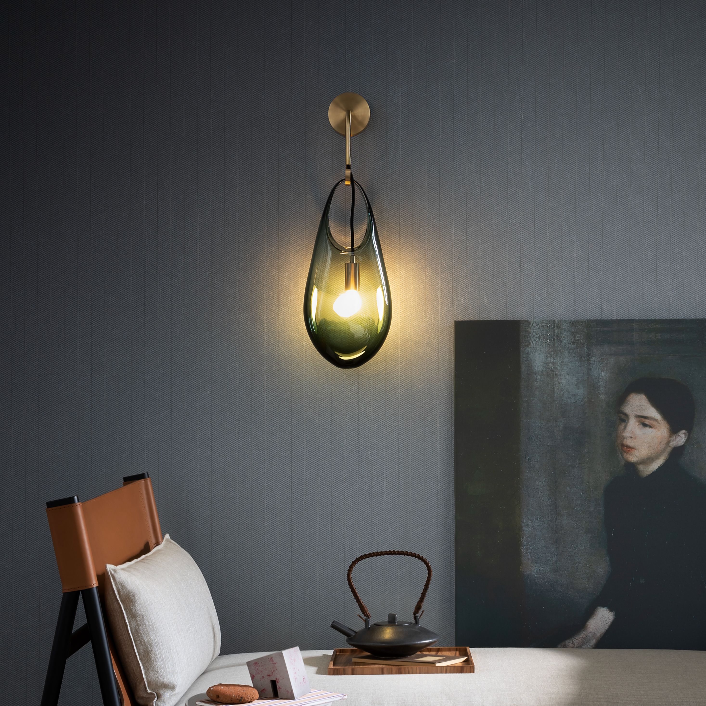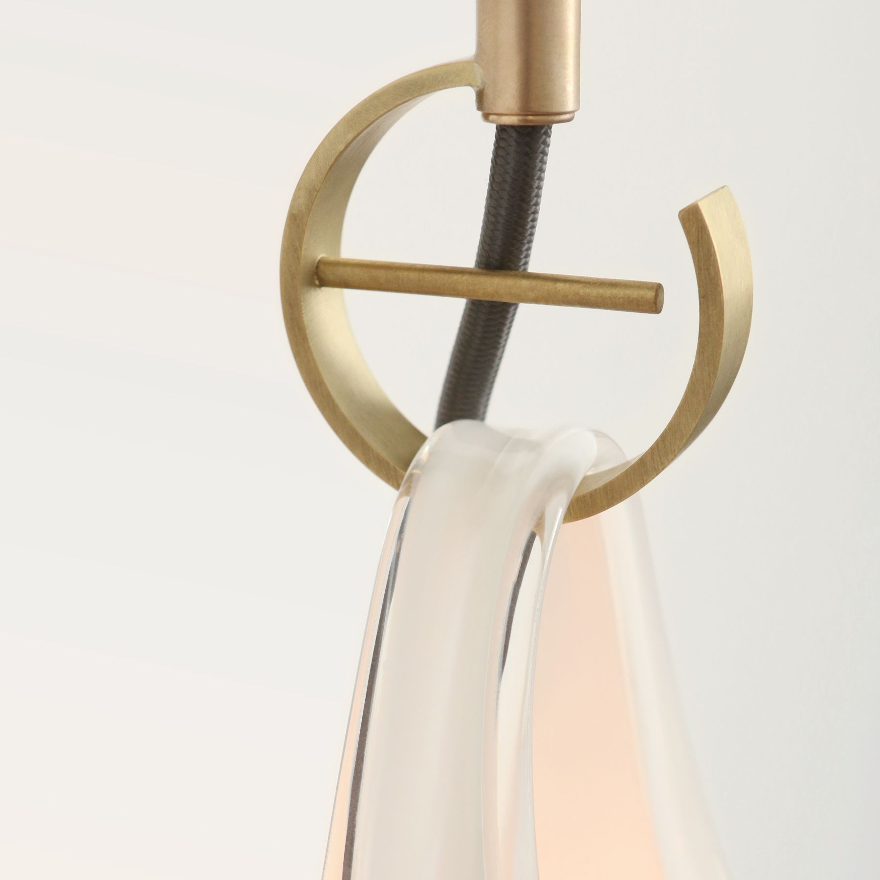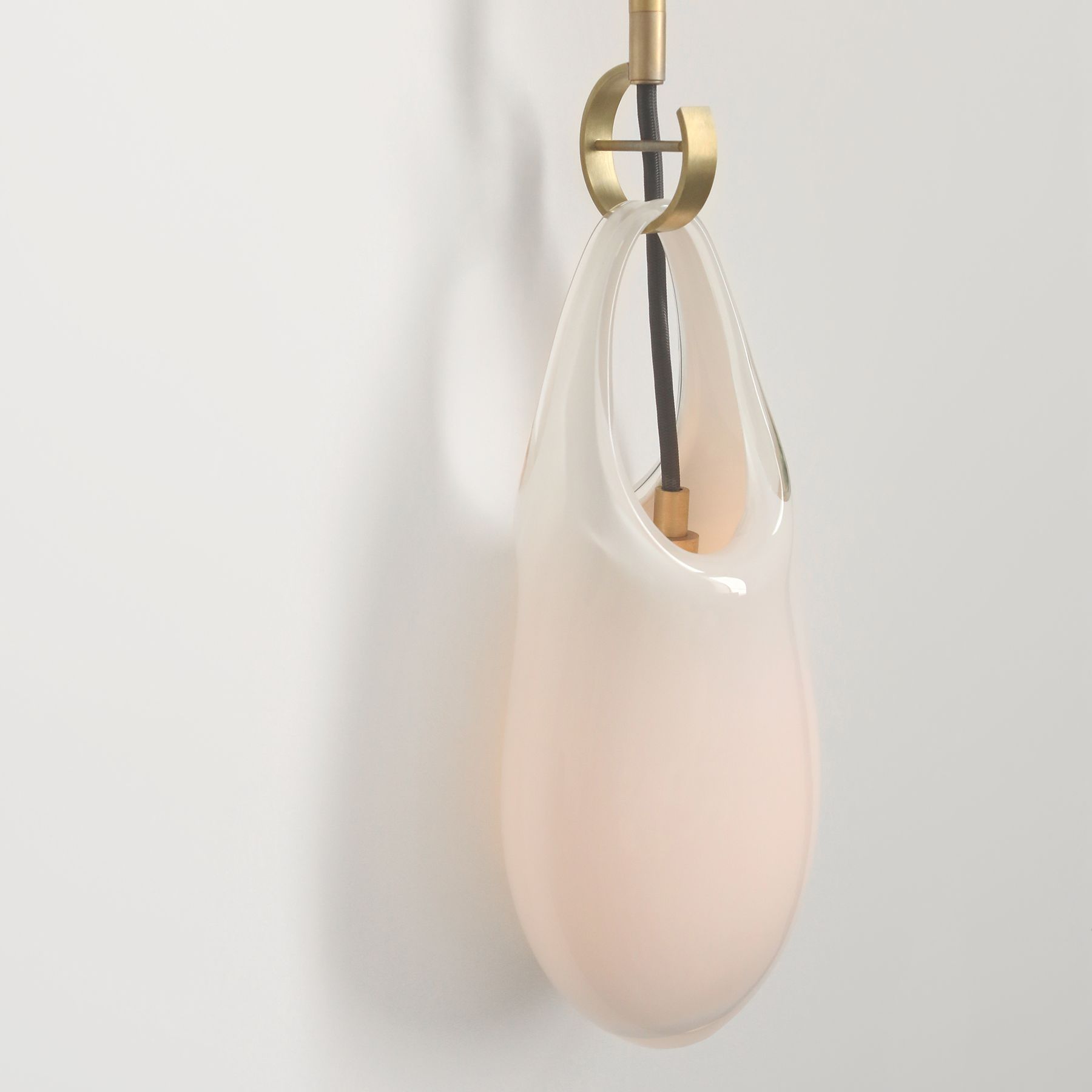 An expressive glass vessel that appears to droop from its hook as if molten serves as a shade on this wall sconce. Available in two sizes. The socket is suspended from the hook on a fabric-wrapped electrical cord and is loosely suspended within the glass. A removable threaded pin within the brass hook can be used to secure the glass if required.