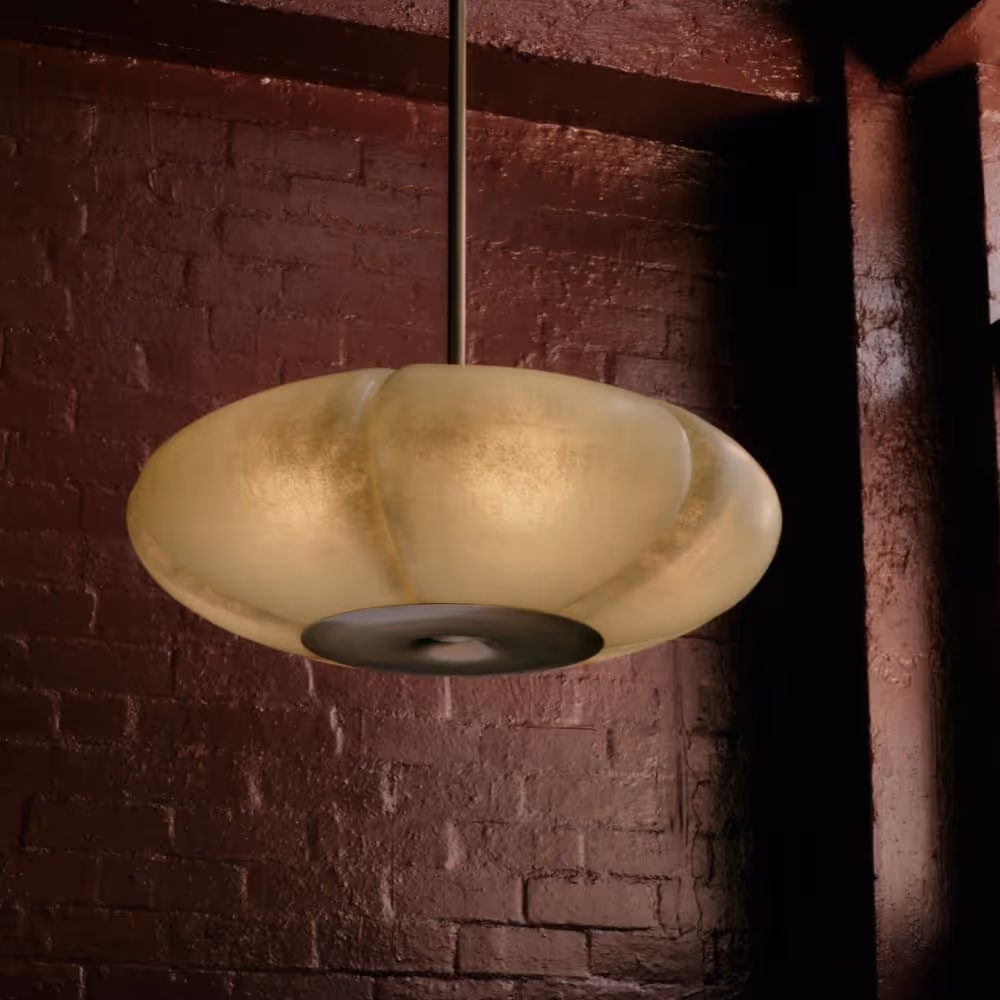 Fleur's richly textured fibreglass segments are held together by two spun brass plates, forming an airy and captivating whole.