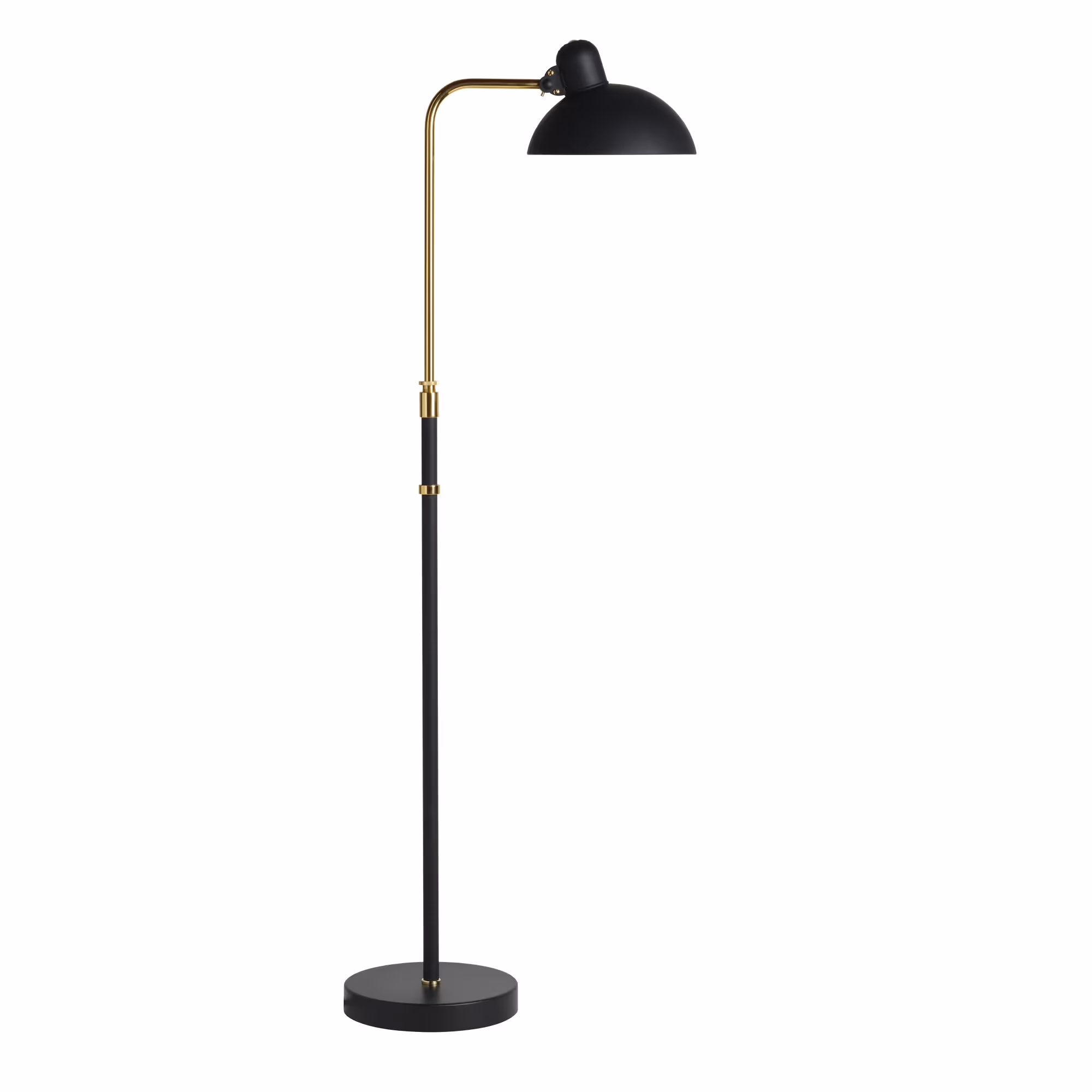 The 6580-F Luxus floor lamp, designed by Dell in 1936, is adjustable in height. The ball-jointed lampshade has an adjustable tilt head for directional lighting.