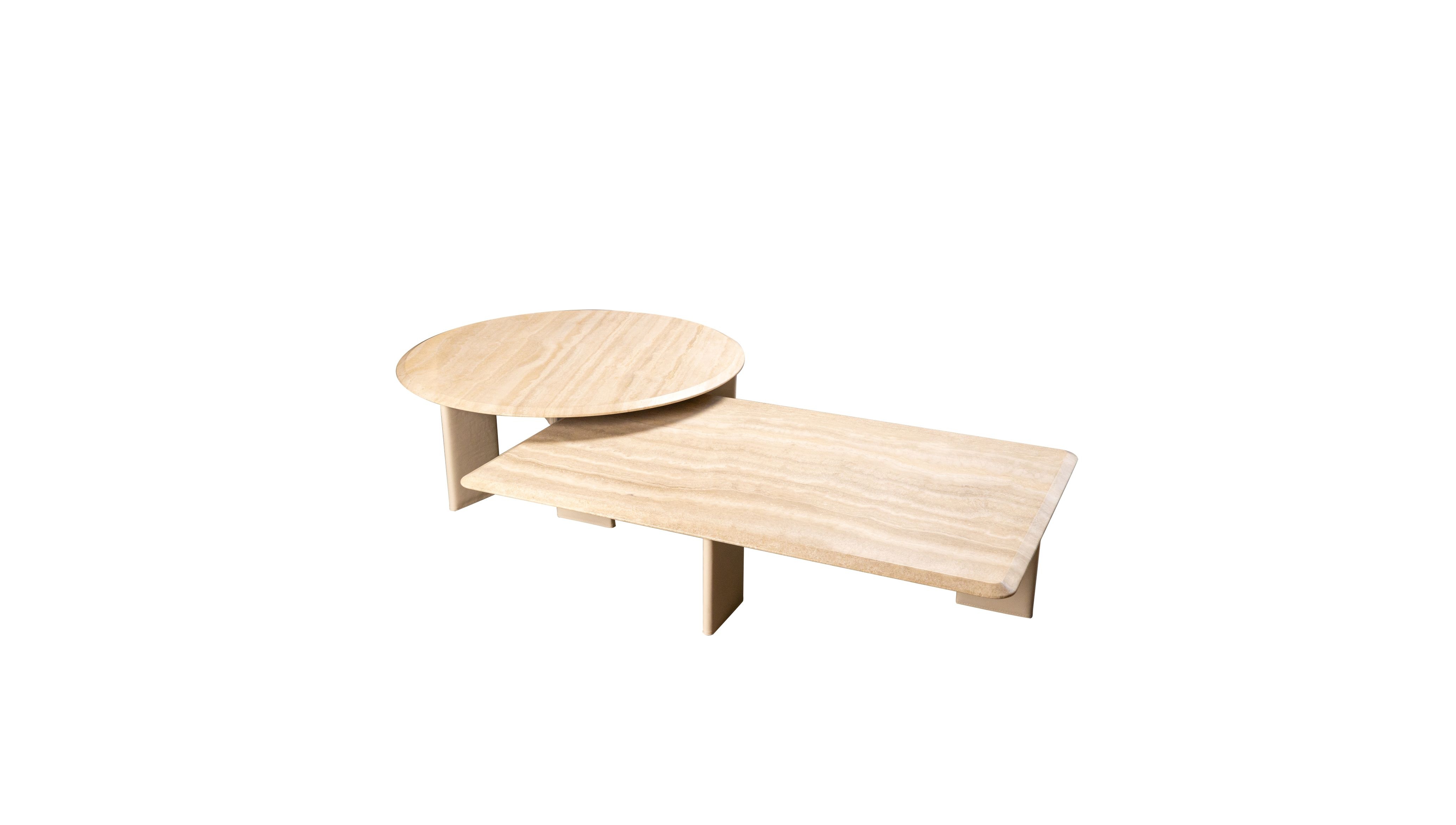 The design is built on a clear relationship between the tabletop and the base: compact, round, or rectangular surfaces rest on bases composed of distinct vertical elements, arranged asymmetrically beneath the tabletop. These supports are off-center and are distributed to create a dynamic balance of solids and voids. The six configurations—generated by combining three tabletop dimensions with two different base heights—allow the side tables to be placed side by side, creating variable compositions where heights overlap and tabletops brush against one another without ever fully coinciding. The marble tops define the object’s presence, while the legs in leather introduce a vertical component that visually lightens the top.
