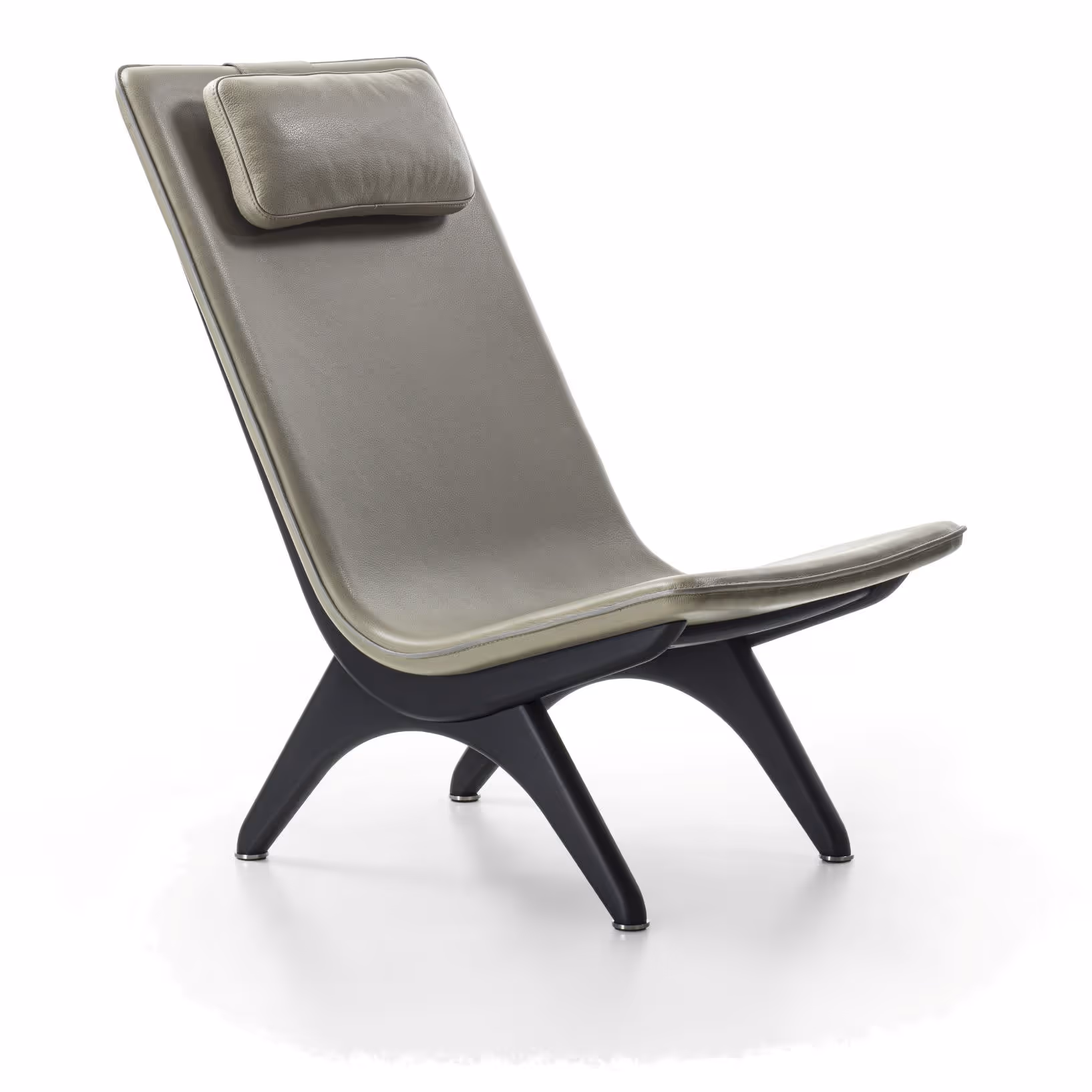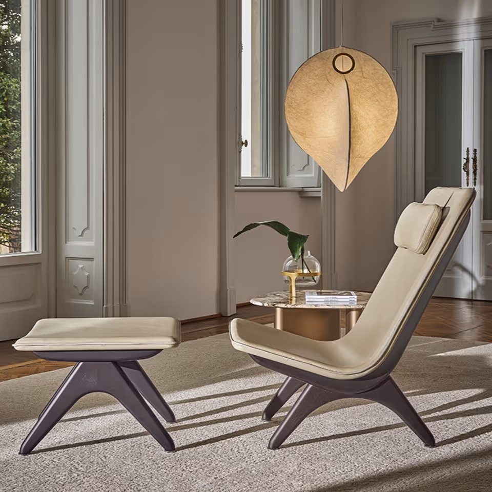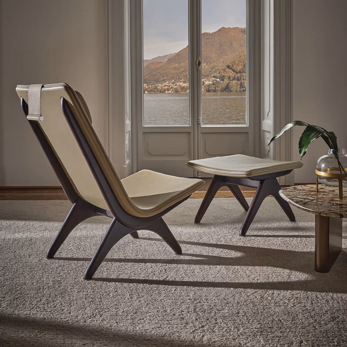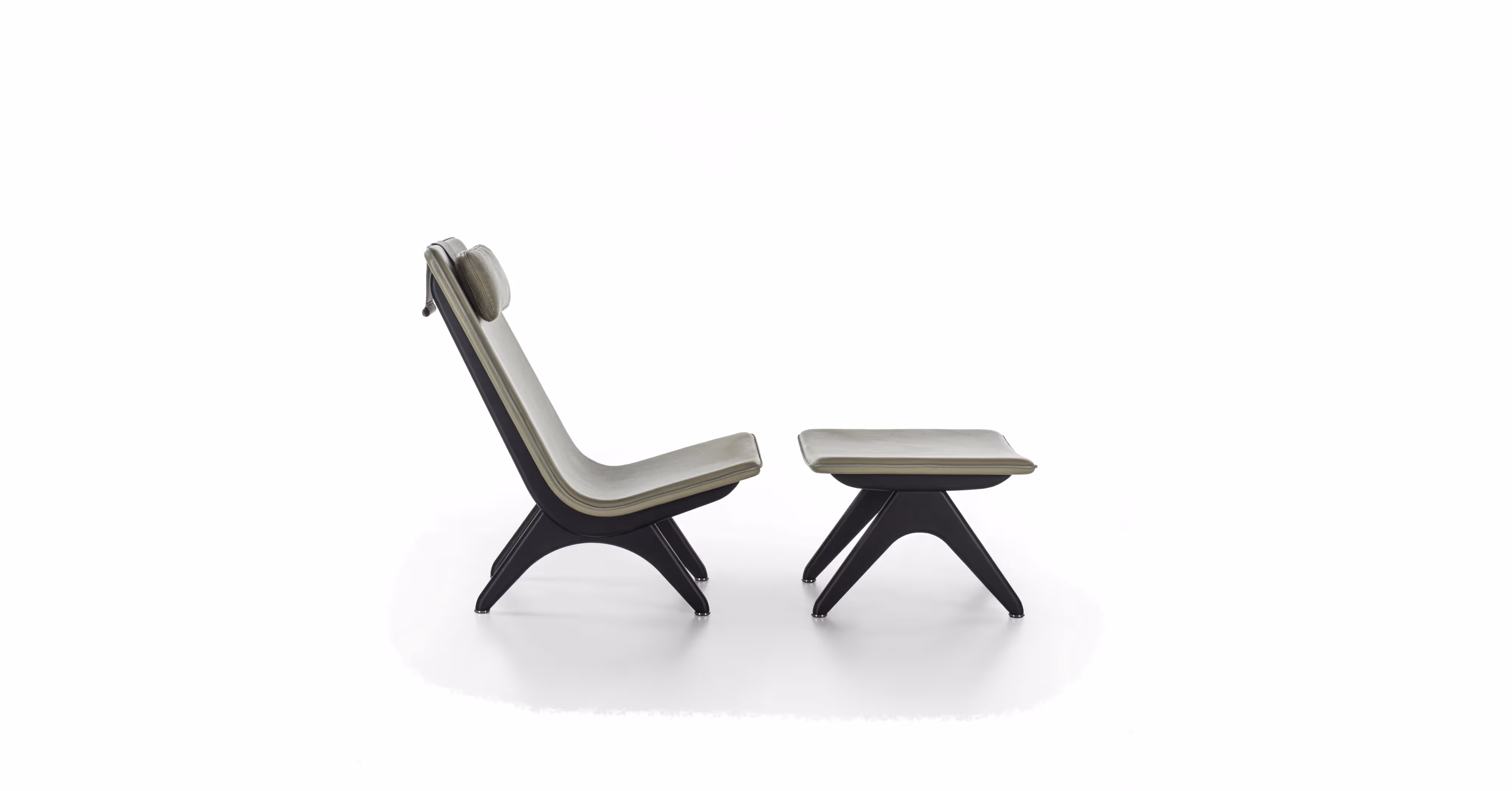 Koko is a small armchair with an ottoman that stands out for its balanced balance of rigidity and ergonomics, strength and lightness, design and functionality. The structure supporting the seat is made of solid Canaletta walnut, which not only provides a solid base but also embraces the seat itself, creating an enveloping effect for moments of comfort and relaxation. The essence is surmounted by an anatomical shell moulded with a layer of polyurethane fixed to the wooden structure. The shell encloses in a single element the function of seat and back, without solution of continuity, and can be customised in the fabrics and leathers in the Porada catalogue. The product’s comfort is also facilitated by the presence of a height-adjustable padded headrest, tone on tone with the shell and characterised by details in black chrome metal, a finish that is also found in the feet.