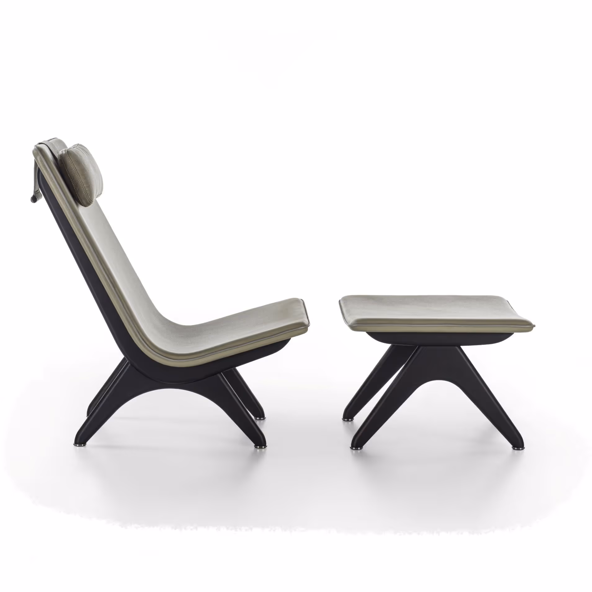 Koko is a pouf, combined with the armchair of the same name, that stands out for its balanced balance of rigidity and ergonomics, strength and lightness, design and functionality. The structure is made of solid canaletta walnut, underlining Porada’s know-how in woodworking. The essence is surmounted by an anatomical shell moulded with a layer of polyurethane fixed to the structure in canaletta walnut, which can be customised in the fabrics and leathers in the Porada catalogue. The detail of the black chrome metal feet complete the stylish features.