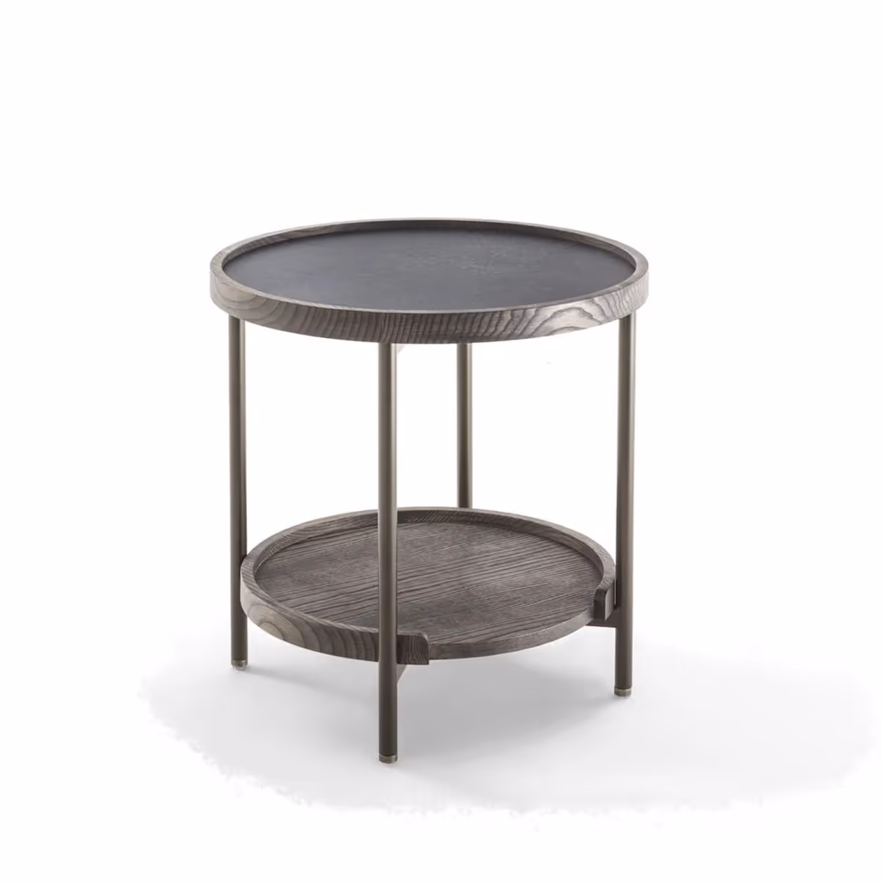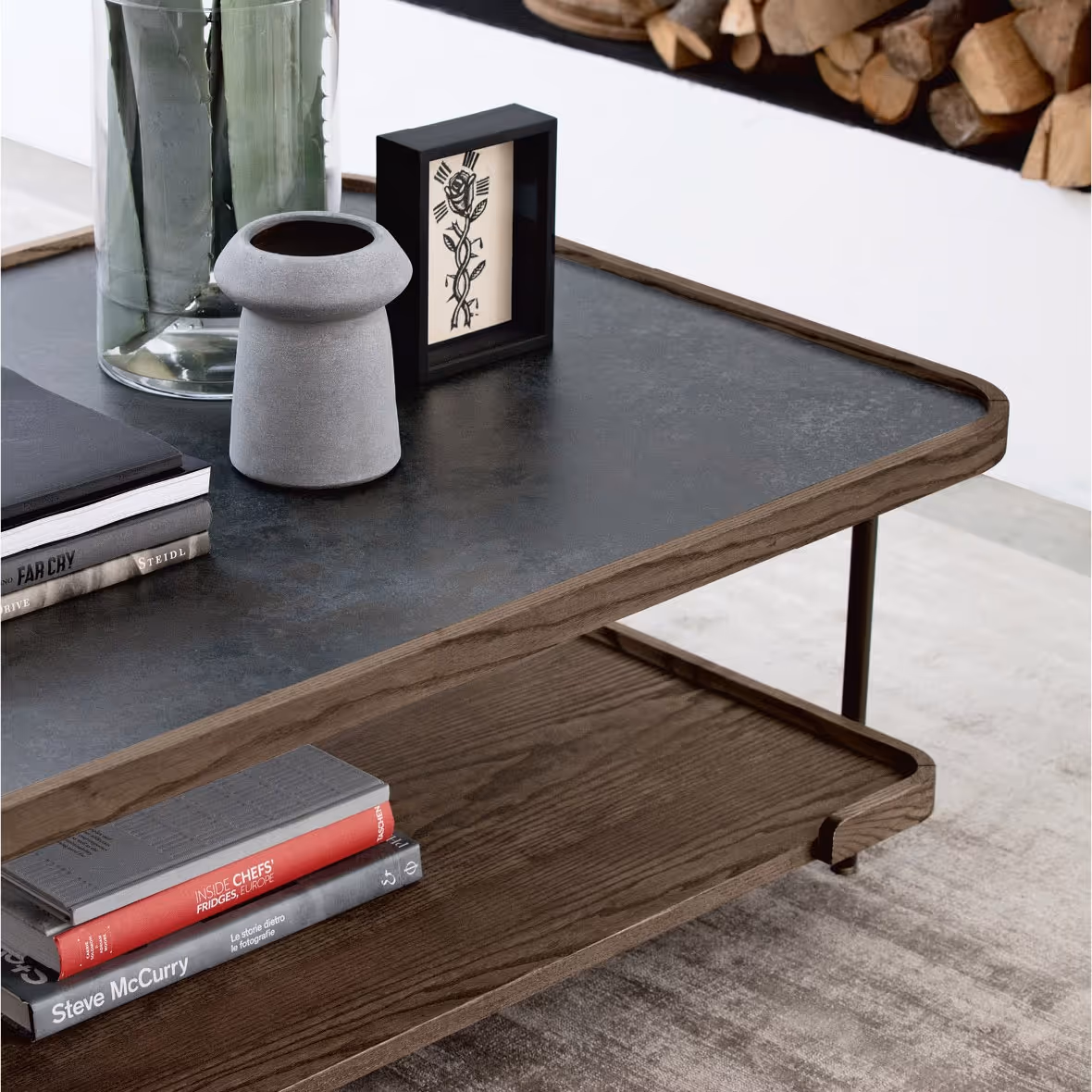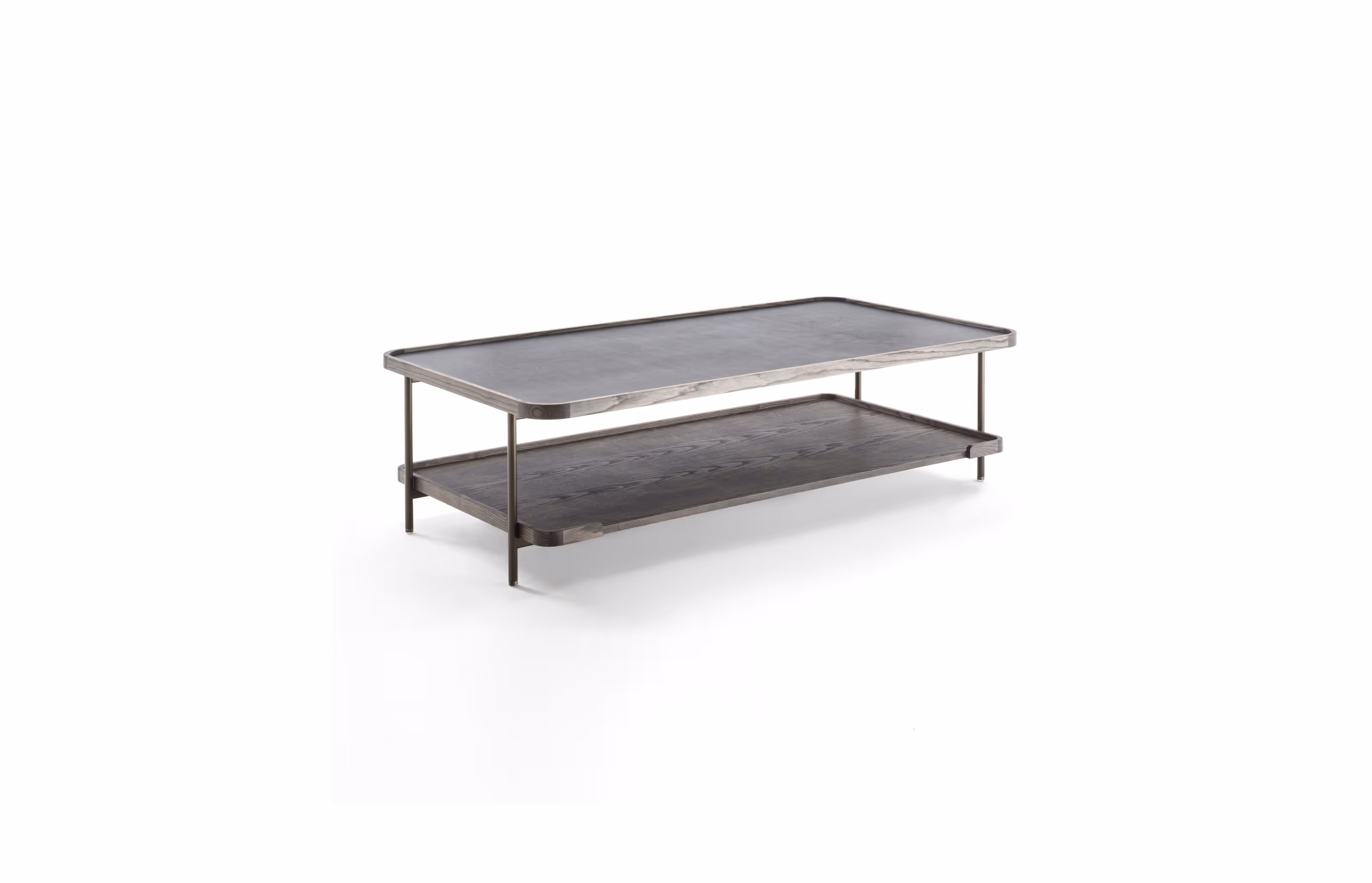 The distinctive element of the collection of coffee and side tables Koster is given by the presence of two parallel tops, supported by a thin metal frame in Bronzoro finish, linked in two X elements that act as a support for the tops.