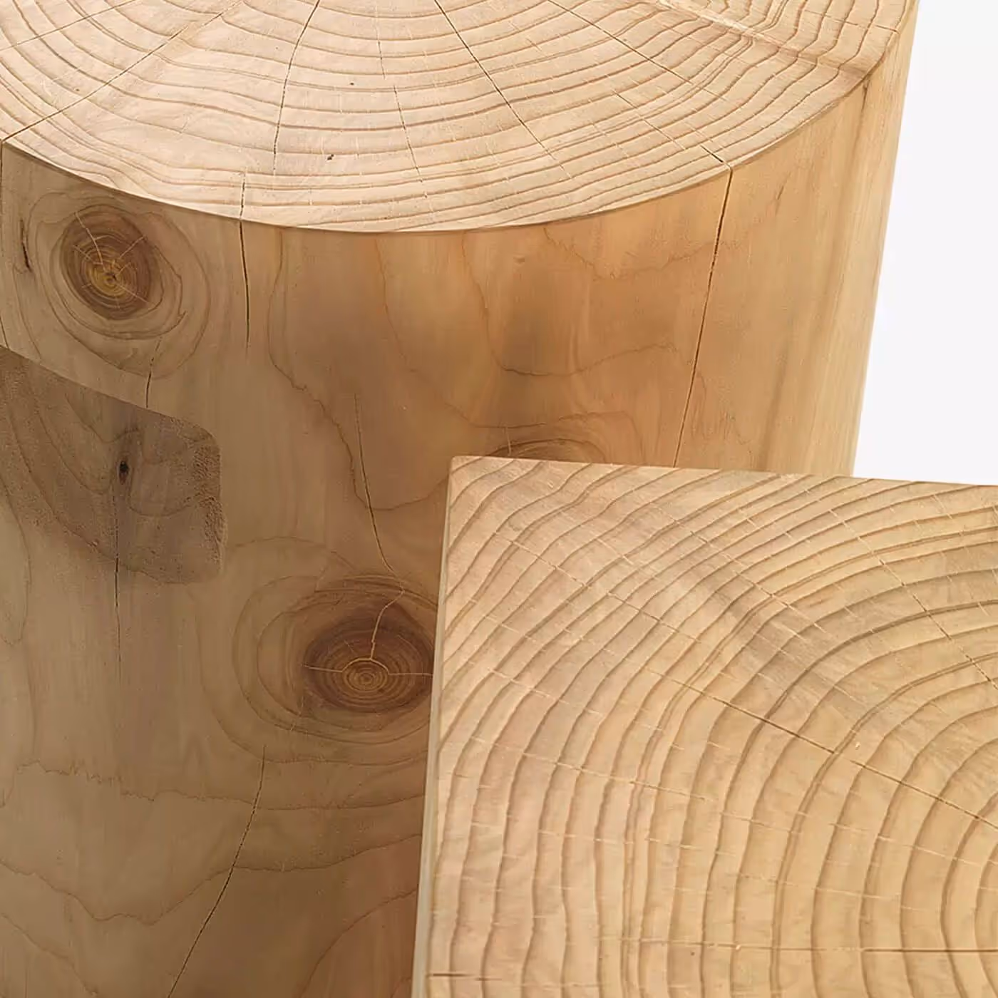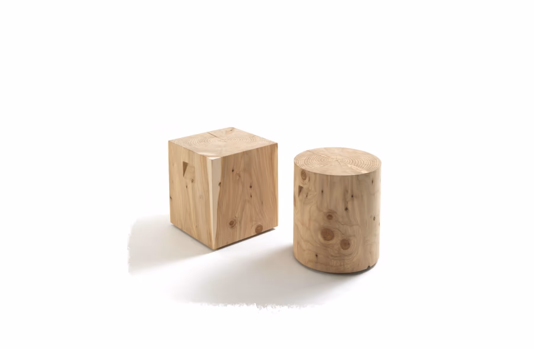 Small table in solid scented cedar made from a section of a tree trunk, available in both square and round shape, equipped with lateral grooves for easy grip.