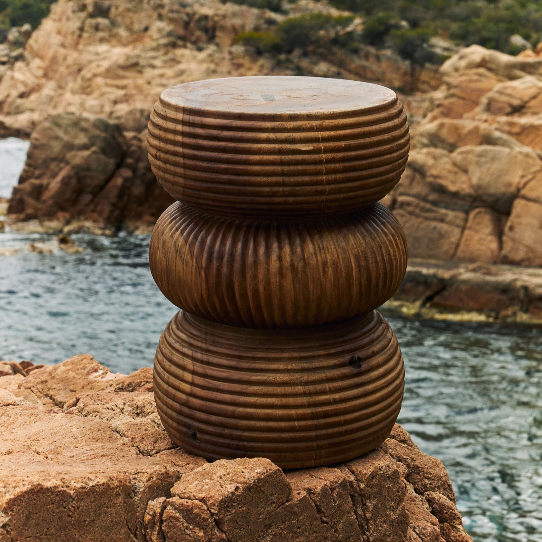 The Luka Stool or side table is a solid block of teak wood, with an organic rippled texture hand carved across its outer surface. A natural finish enhances the organic quality of this stool.