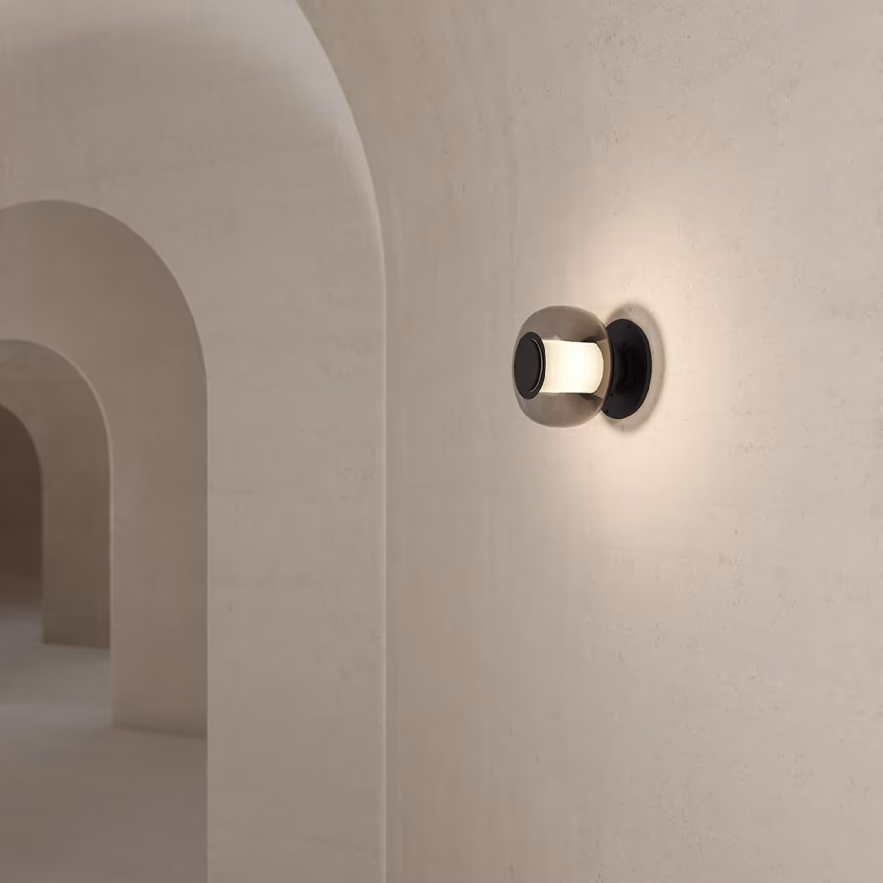 Highlighting the beauty of blown glass, the Luna A Series stands out by its simplicity and elegance. A soft interplay between full and half full shapes, the Luna A Small Sconce embodies a glamorous reference to the moon’s diffused light. Luna A Small Sconce is available in black hardware with smoked or bronzed glass and black, bronze and brass metal.