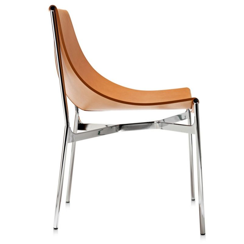 The Lyo has a tubular structure in polished chrome, and back and seat in self-supporting moulded saddle leather.