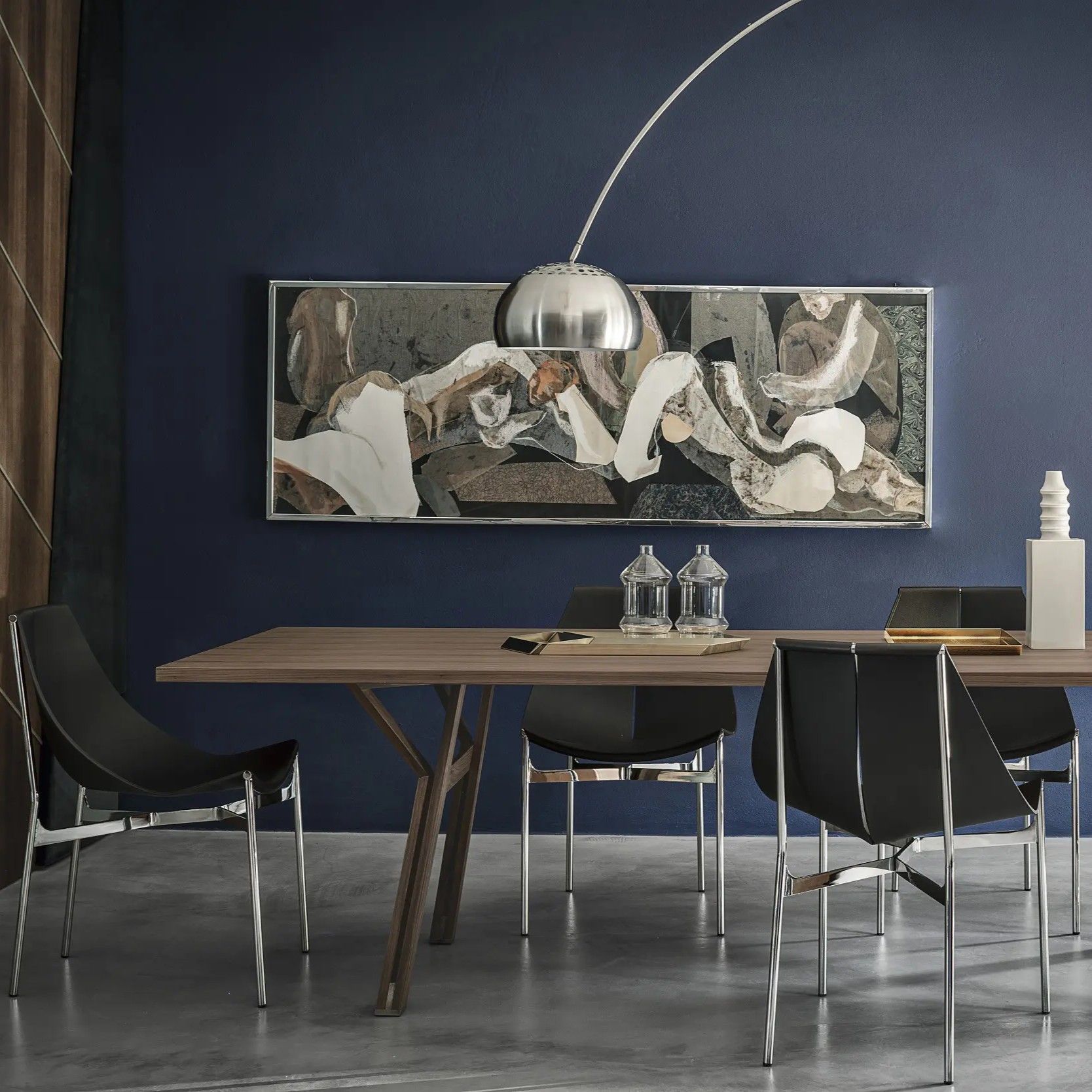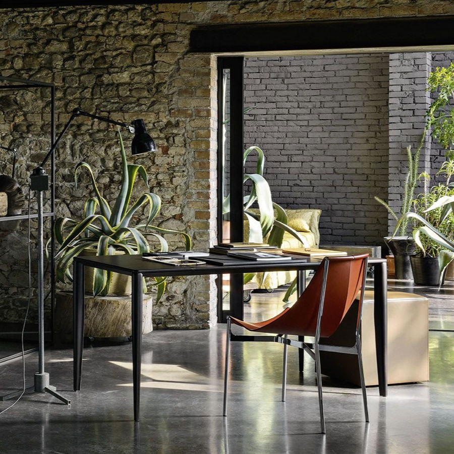 Lyo combines minimalism with luxurious materials: the chrome-plated metal legs, connected by compact crossed elements, support a single load-bearing sheet in moulded saddle leather. A central cut adds character and charm to the contemporary design of this chair.