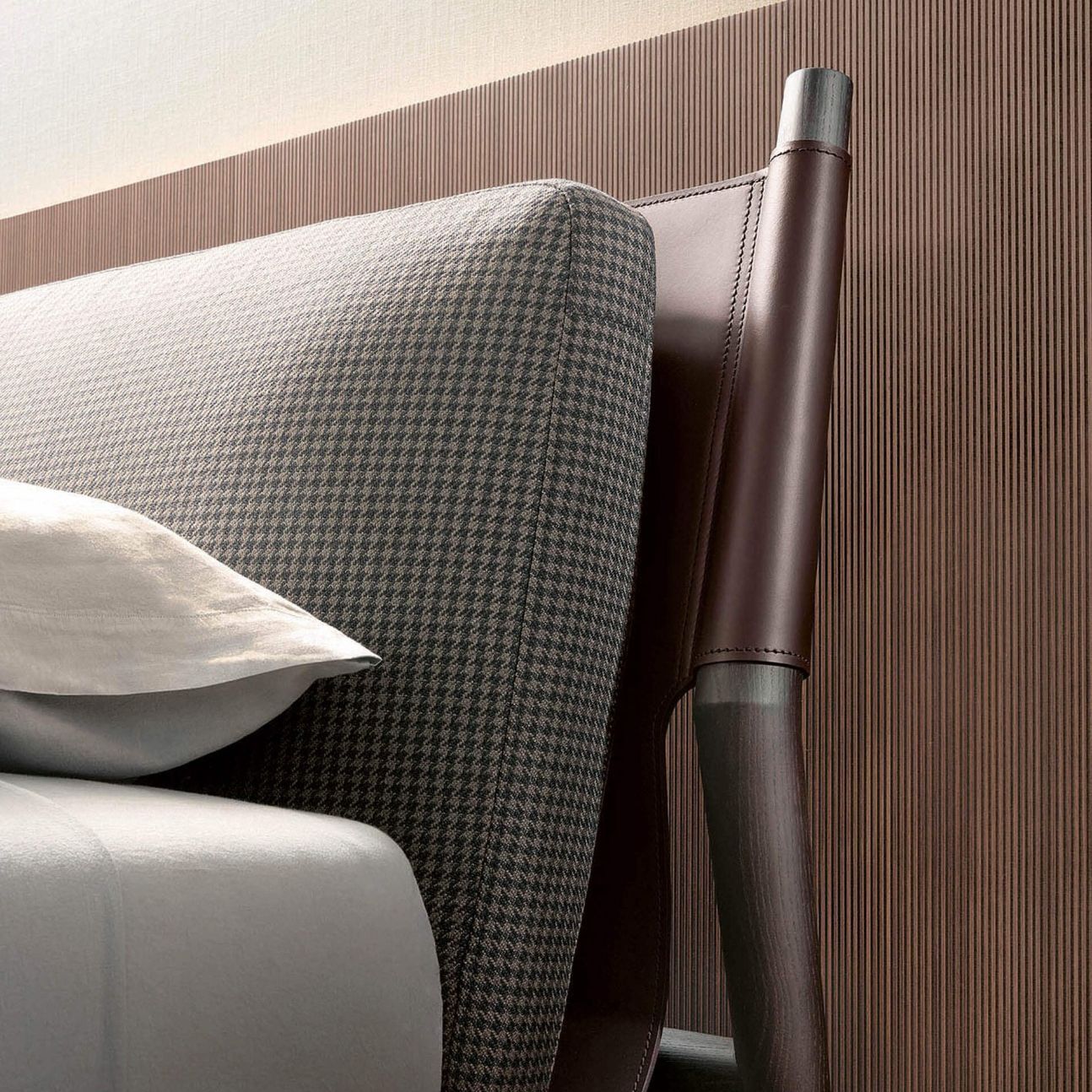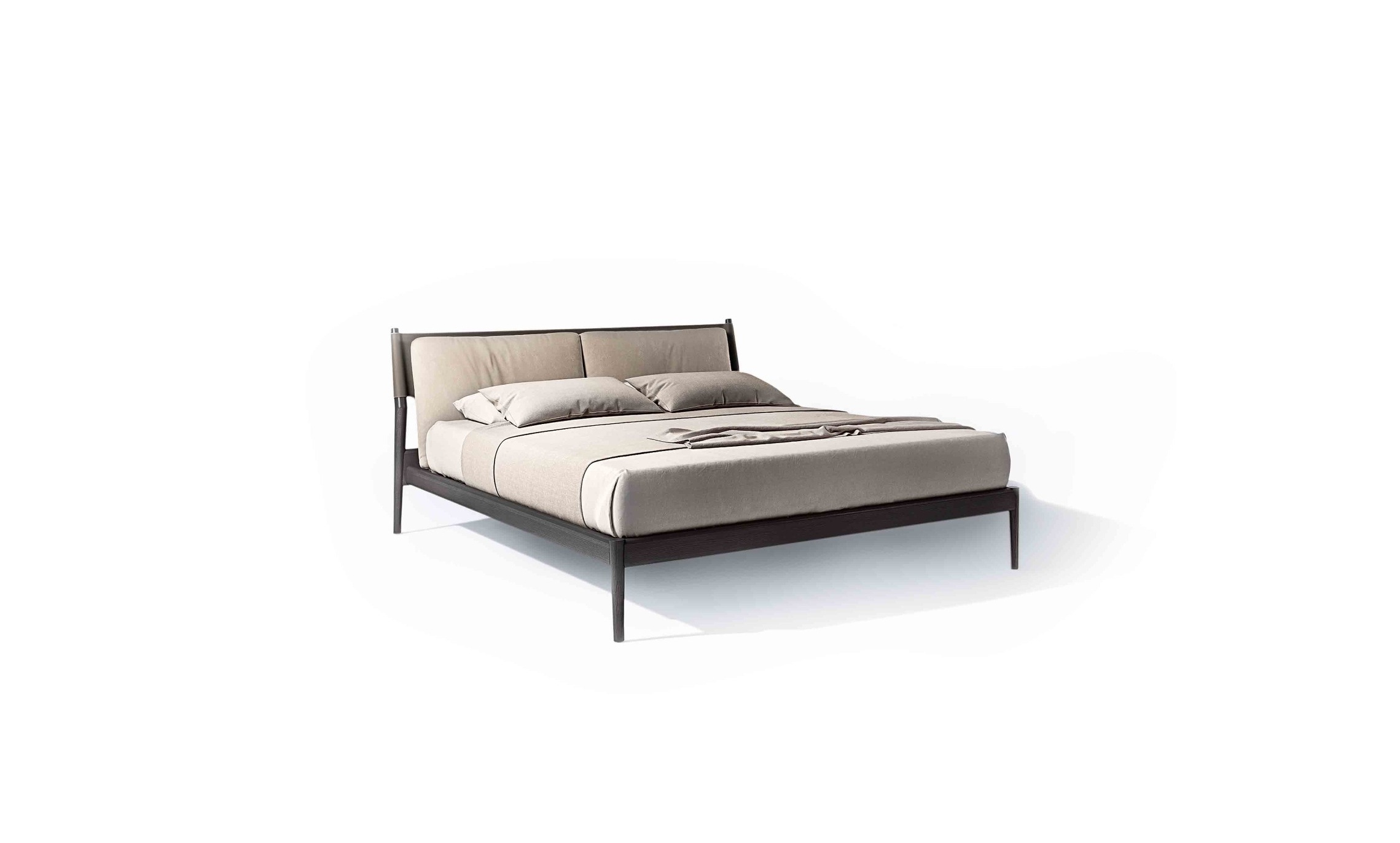 Dainelli Studio draws profound inspiration from Leonardo Da Vinci’s flying machines, copying the wooden elements and sails to create unusual combinations for a rigorous elegant piece. At the heart of Maddox is the stunning combination of wood and leather, with the frame made from heat-treated, oak-dyed ash and the headboard in light structural leather, with double cushioning at the front covered with fabric or leather.