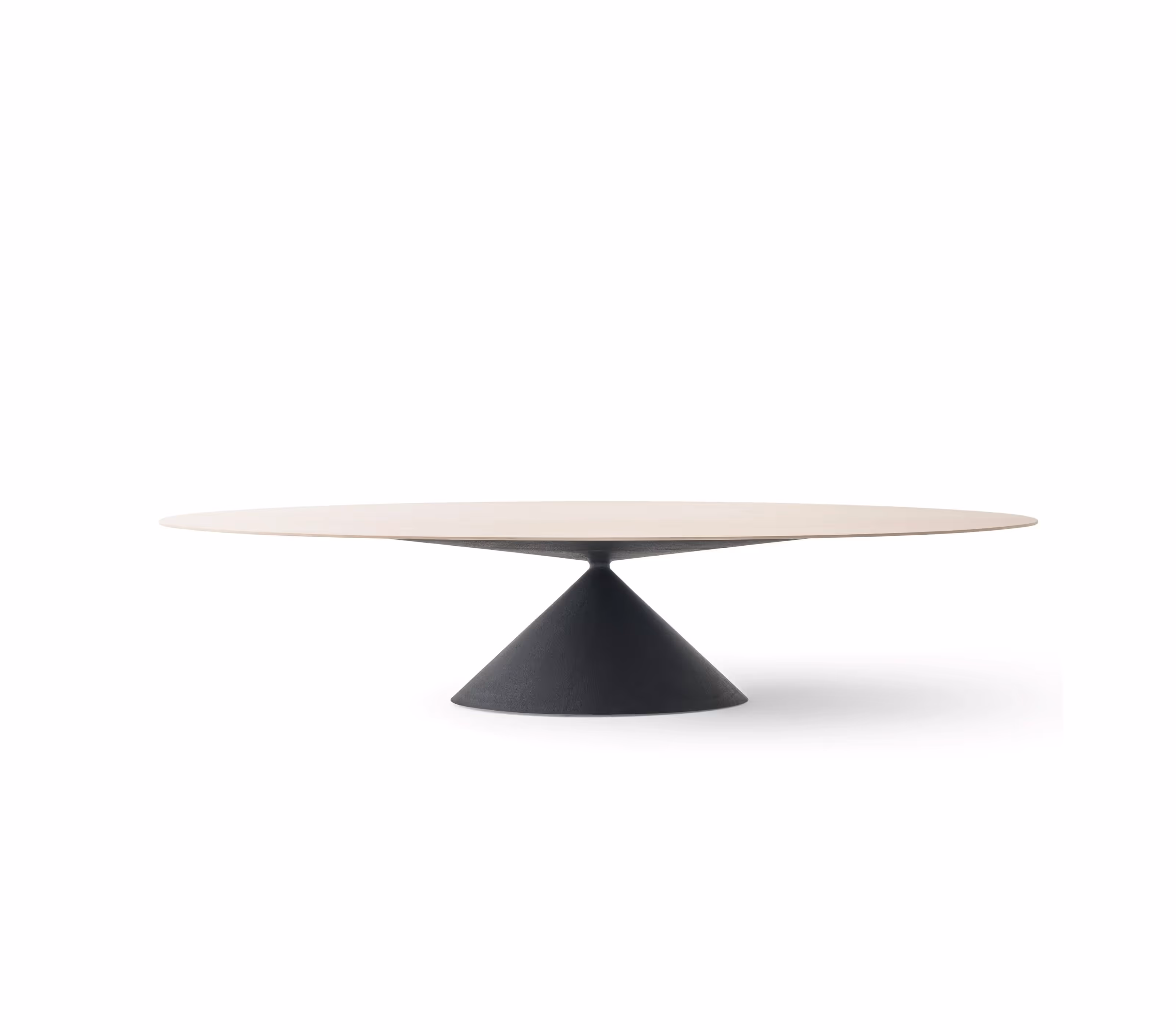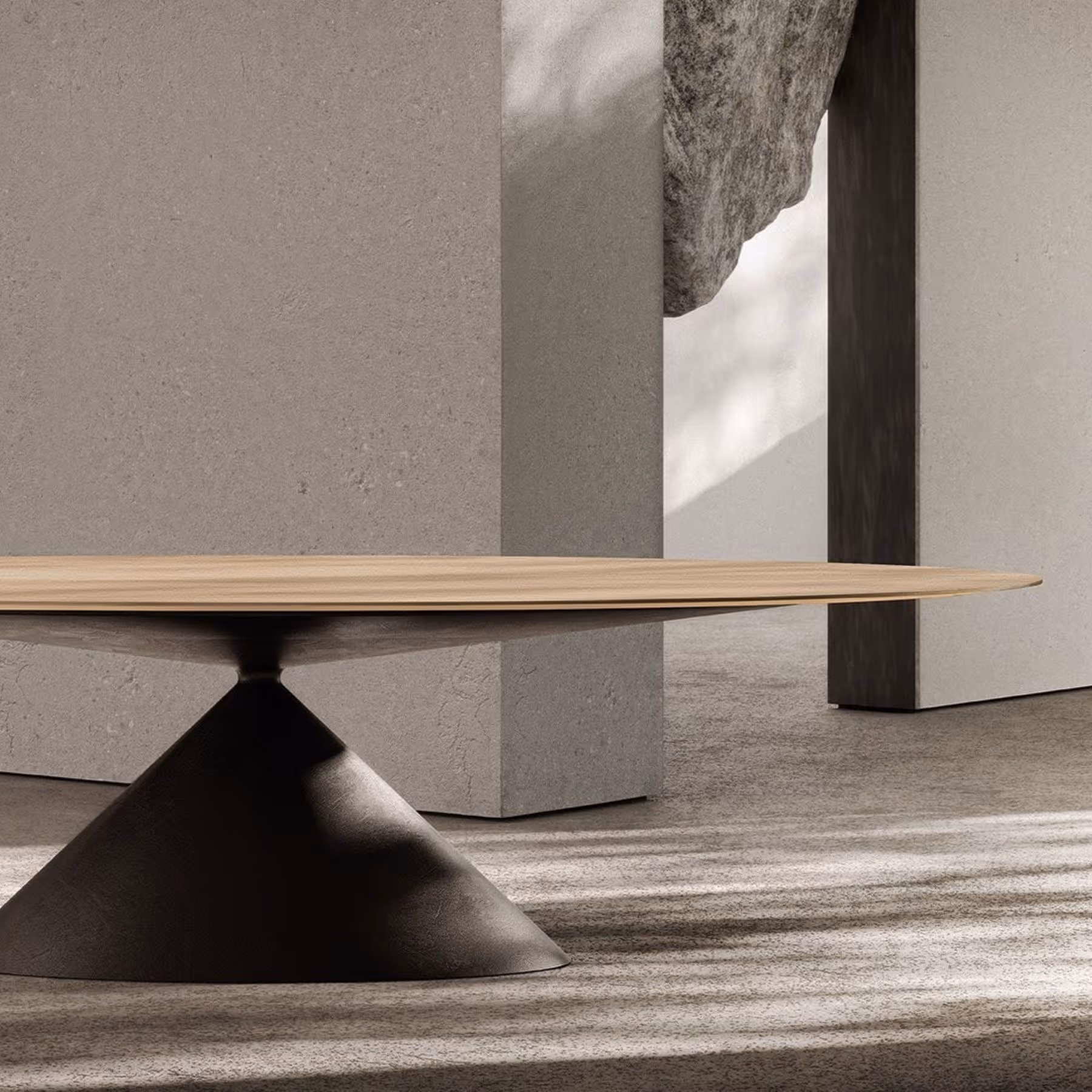 The Maxi Clay table has a strong scenic presence; its expanded proportions highlight the balance between art and engineering, between sculpture and function. The conical volume of its bases and the surface of the top engage in dialogue with light and space, creating reflections and shadows that shift throughout the day. In these settings, Maxi Clay stands as the visual and symbolic centrepiece of the environment — an iconic piece that combines monumentality and lightness, conceived for spaces that aspire to express elegance and contemporary sophistication.