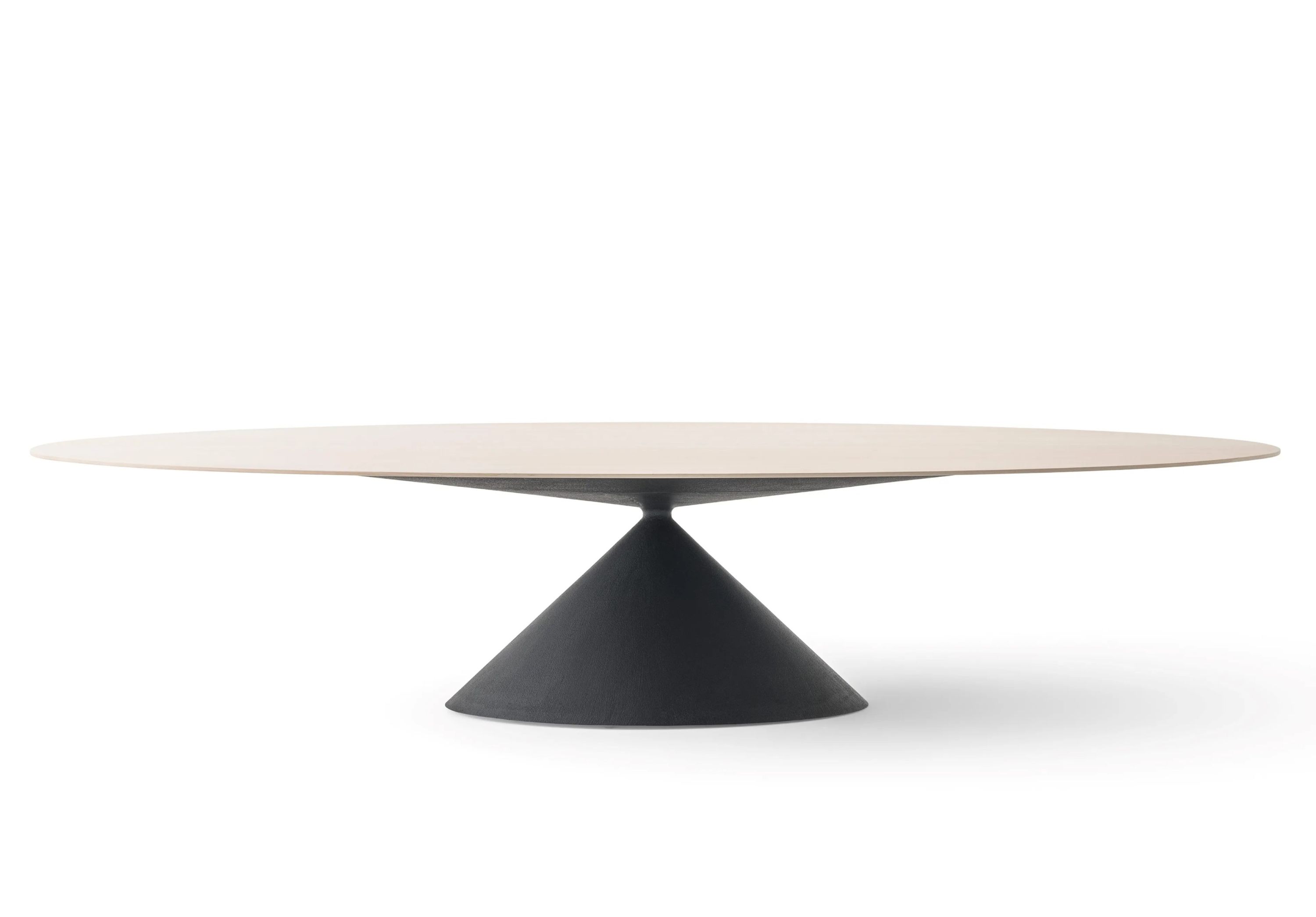 The iconic Clay table reaches unprecedented and generous dimensions until it becomes MAXI. A surprising 3,5 metres oval top offers new perspectives and expands the possibilities of to domestic environments and otherwise, featuring a precise and clear graphic sign in a perfect union between harmony of shapes and solidity of the material.