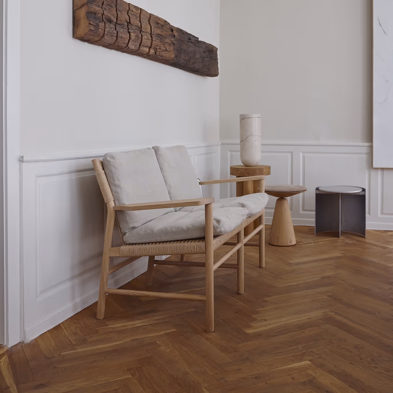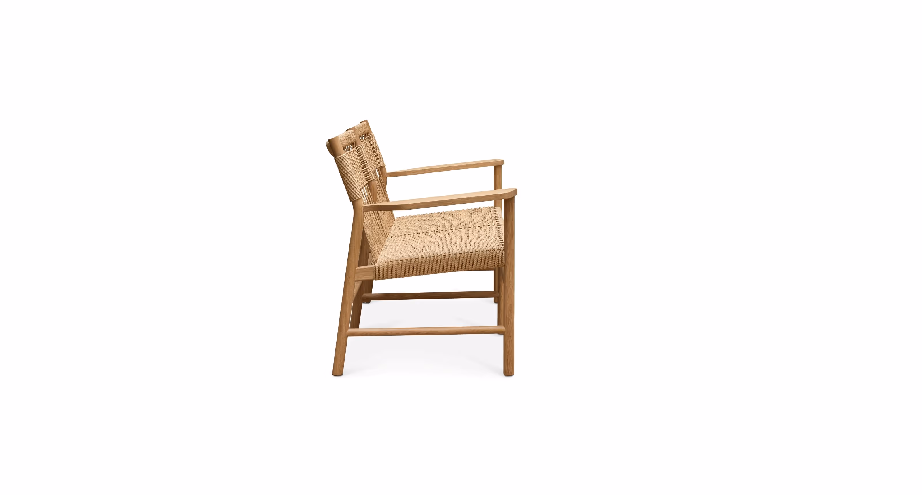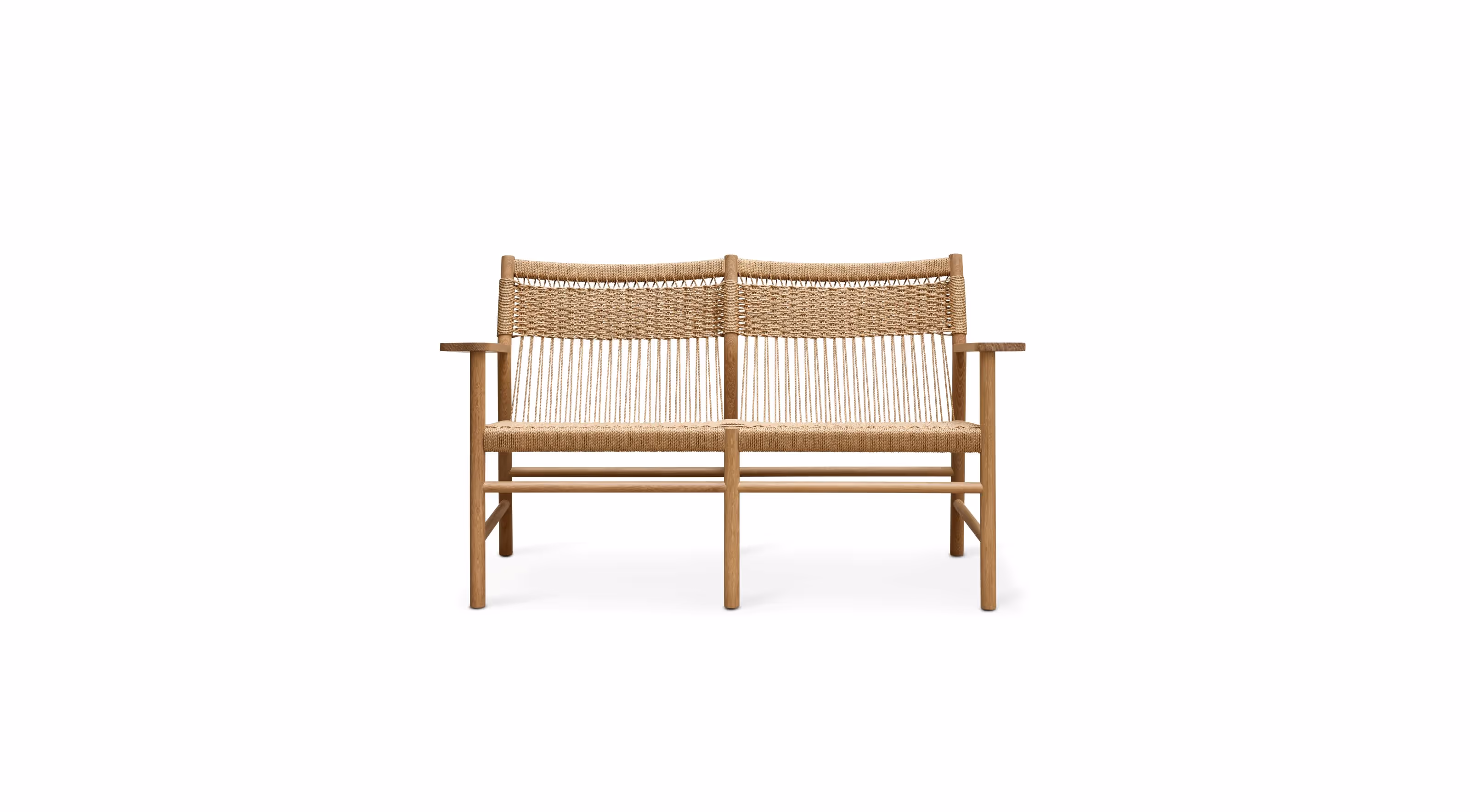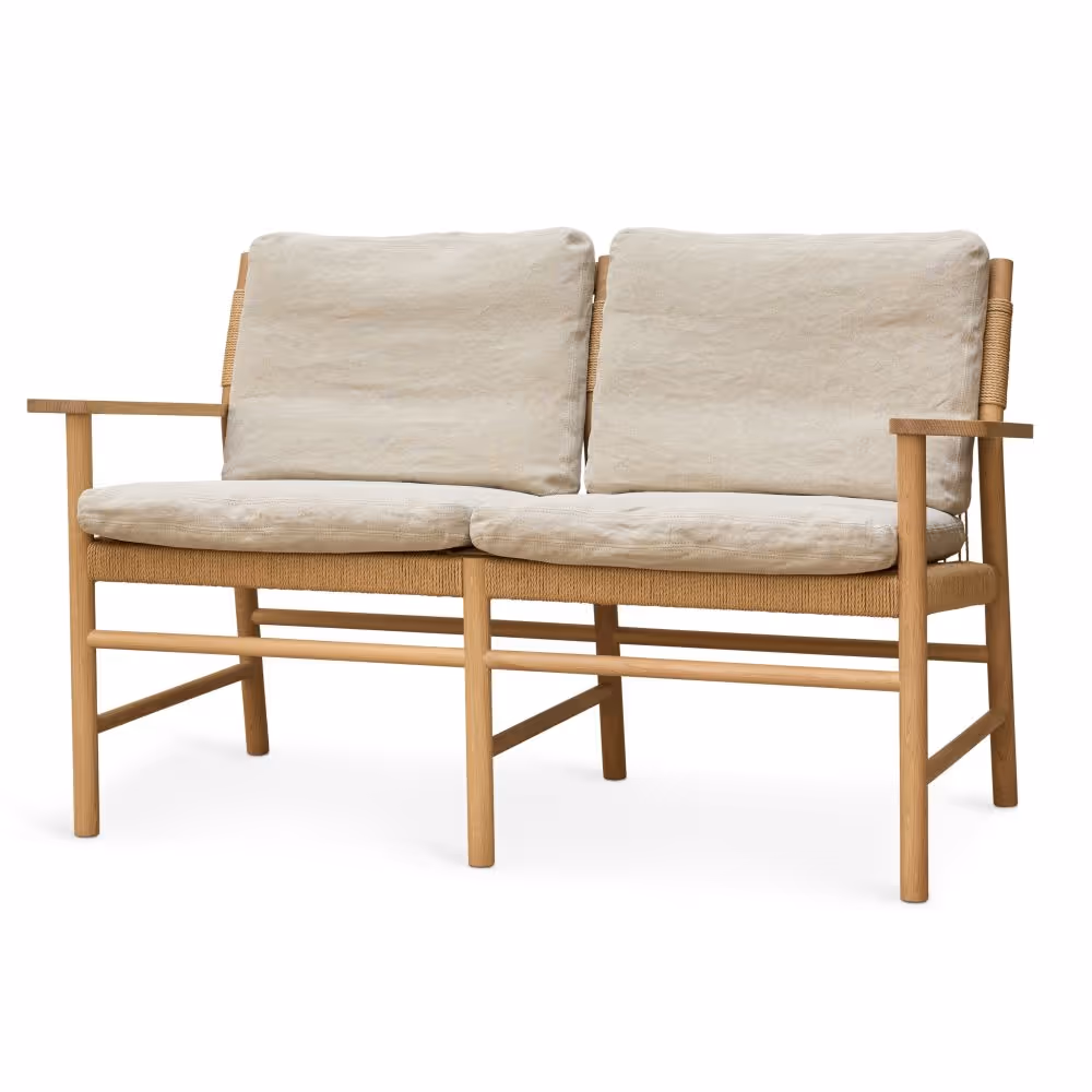 MG112 is an elegant dining sofa with armrests designed by Space Copenhagen. The sofa is made in Malte's workshop in Herlev, where most components are handcrafted. The seat and back are hand-woven from paper cord, making the chair comfortable, durable, and sturdy.
