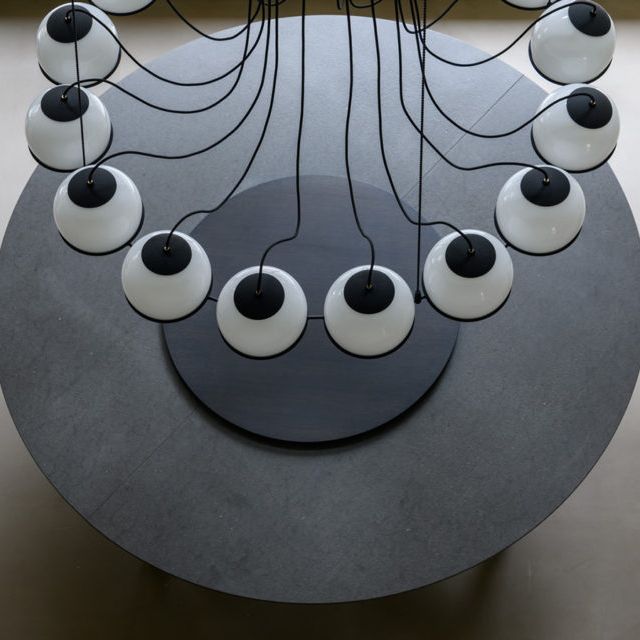 The refined ceiling light is composed of nine blown opaline glass spheres supported by a painted steel mount and structure with a Black or Champagne finish. Each sphere measures 20 cm in diameter and is gently held in place by the painted steel ring in a refined embrace that lends the luminaire a graphic expression and brings forth Le Sfere’s distinctive aesthetic.