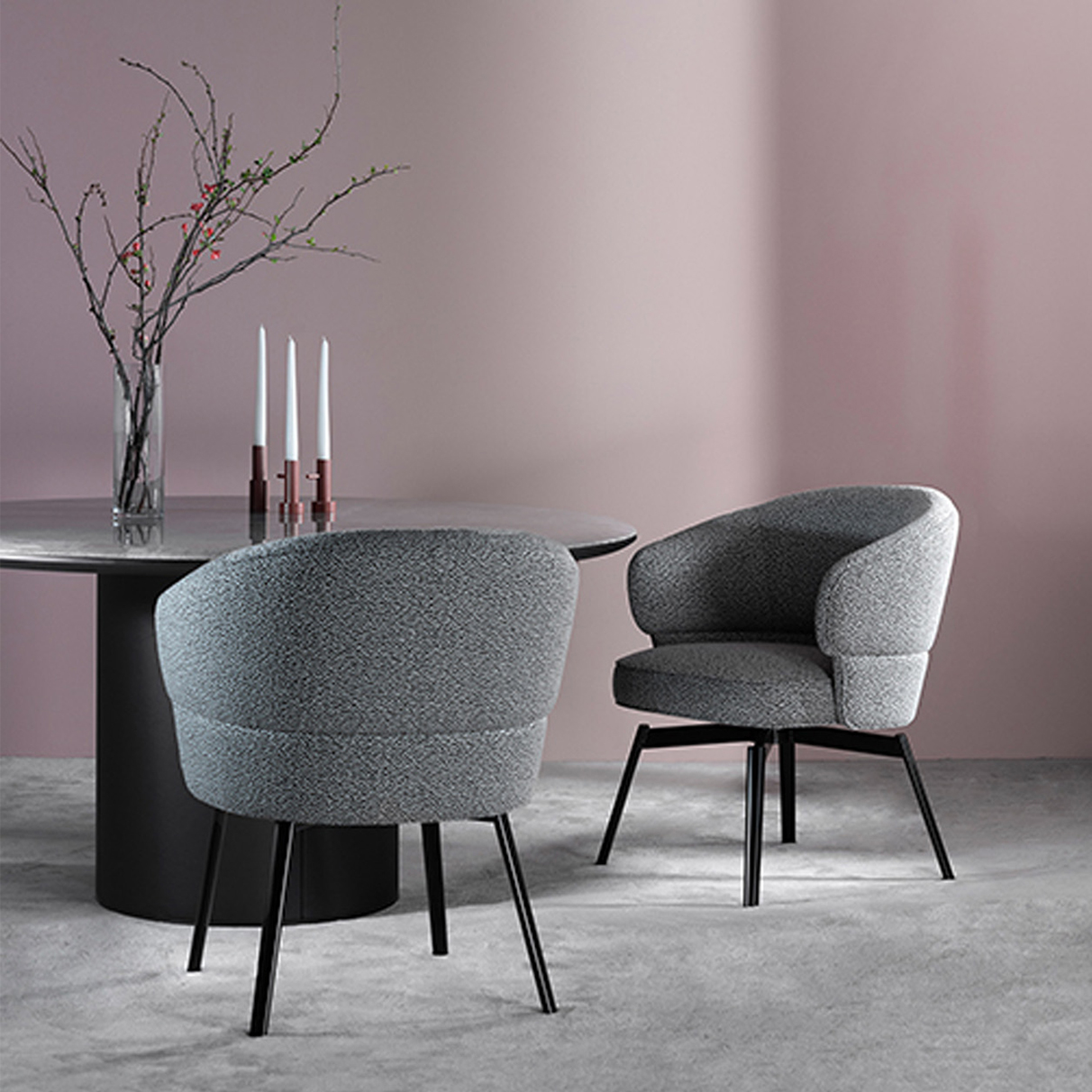 Identical in design to the other members of the MORTON family, with a pocket-spring core and a layered polymousse structure, the fine dining chair is painstakingly handcrafted with the highest quality upholstery material. The sweeping backrest arcs far forward, segueing gently into an armrest. Relaxed and, above all, lengthy and extremely comfortable seating experiences are a given. Like the MORTON Chair, the fine dining version is also available with wooden legs or – for aesthetic lightness – with black grey powder-coated metal legs and swivel mechanism.