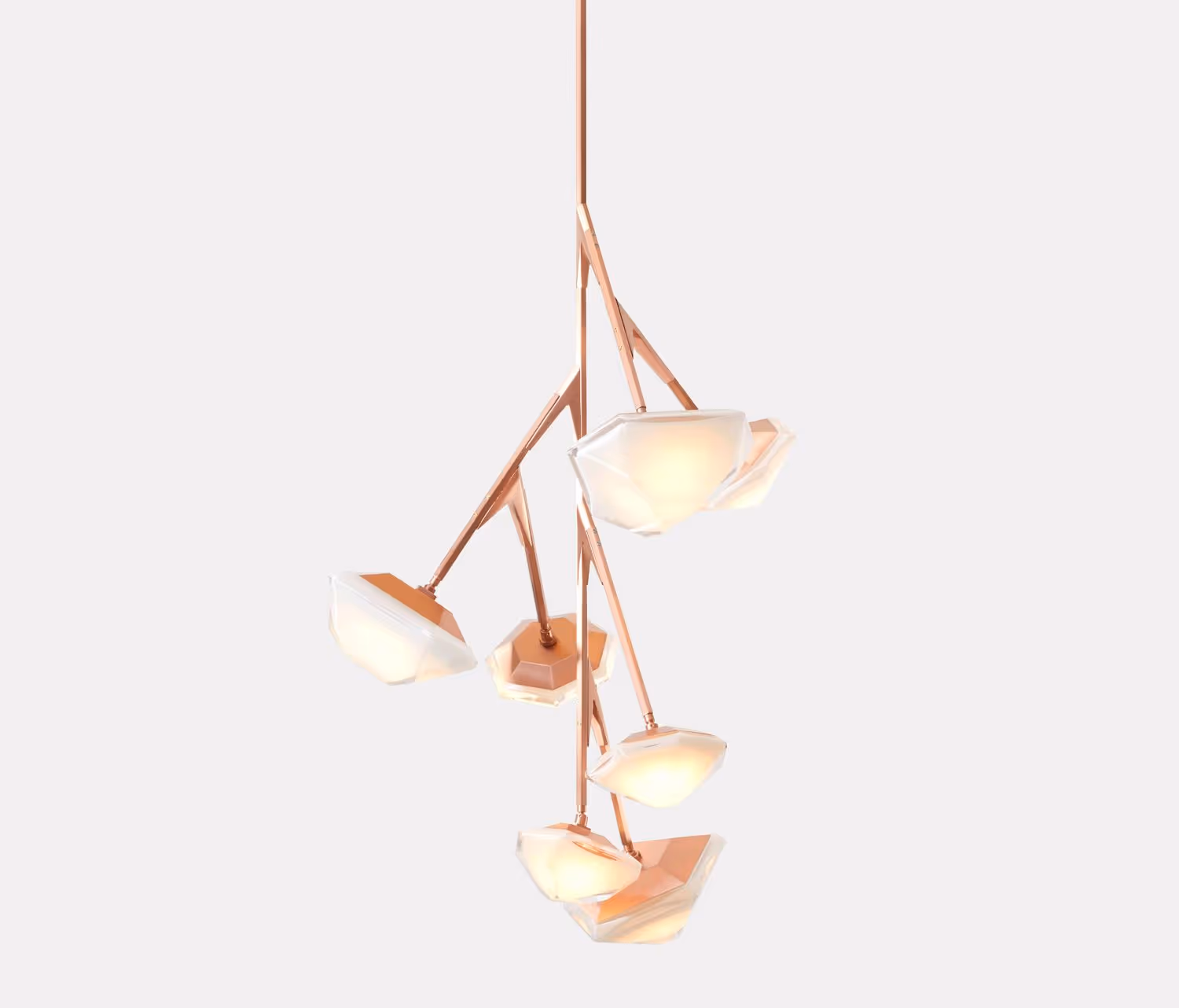 Designed with bioluminescence influences, the Myriad Chandelier elegantly combines alabaster white double-blown glass and a modular, asymmetric system to create a sculptural lighting fixture that evokes nature.