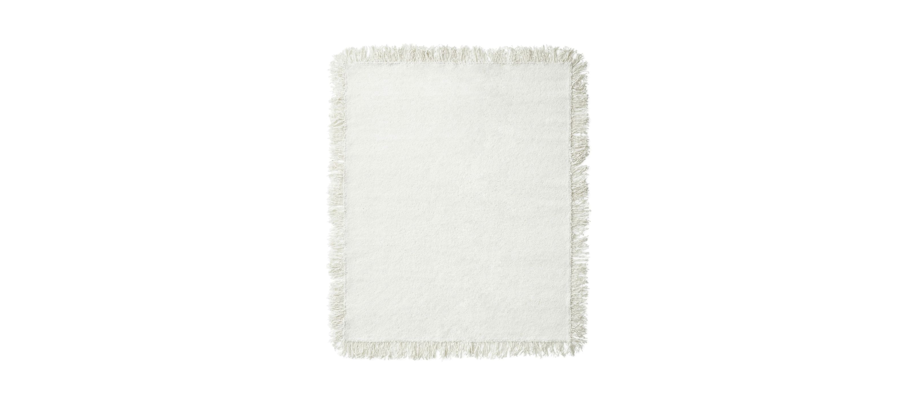 Handknotted, Curly handspun fringes (approx 180-200mm), Natural, unbleached New Zealand wool, for softness and durability. Designed in Scandinavia, handmade in Bhadohi, India.