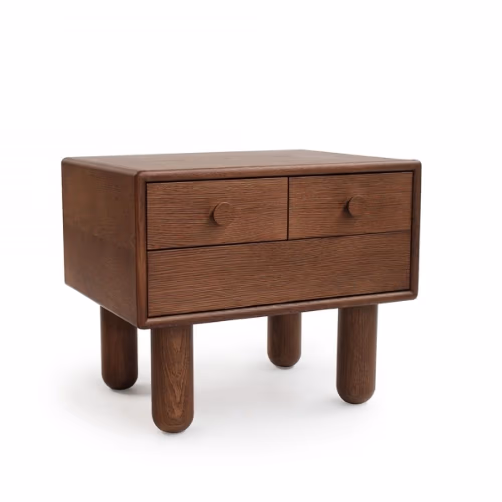 Beautifully crafted wooden bedside table featuring a minimalist design with soft, rounded edges. It has three drawers with circular wooden knobs, offering practical storage while maintaining a sleek aesthetic.