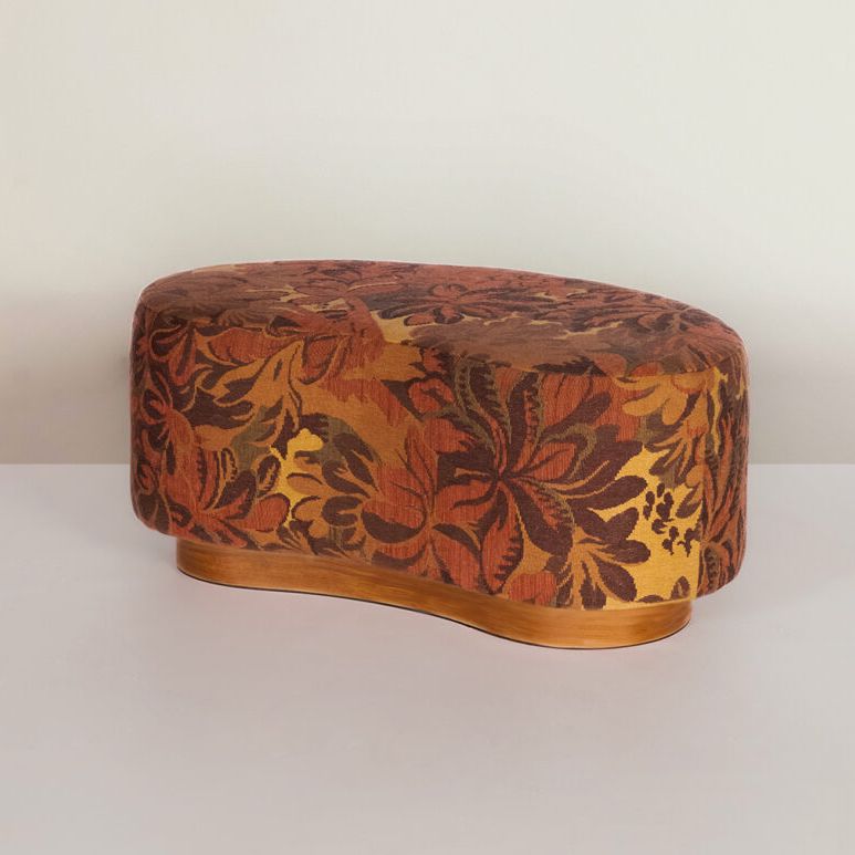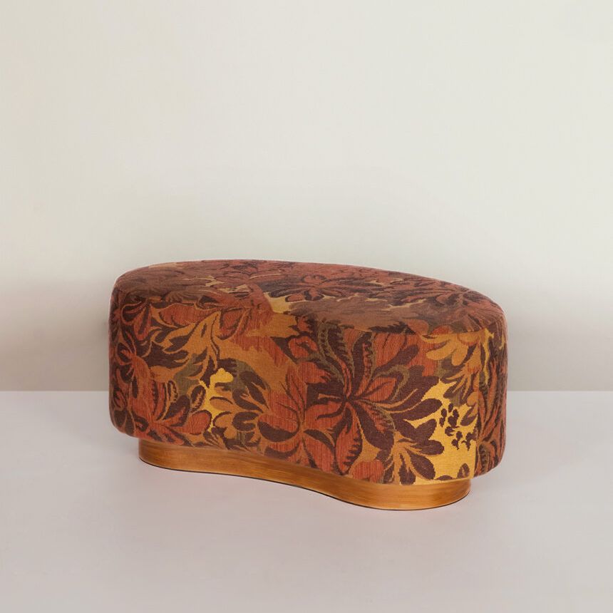 This pouf blends artistic design with everyday comfort. Upholstered in rich fabrics and set on an afrormosia wood base, it showcases organic shapes and intricate patterns. Its warm tones and soft form invite relaxation while adding a stylish touch to any modern space.