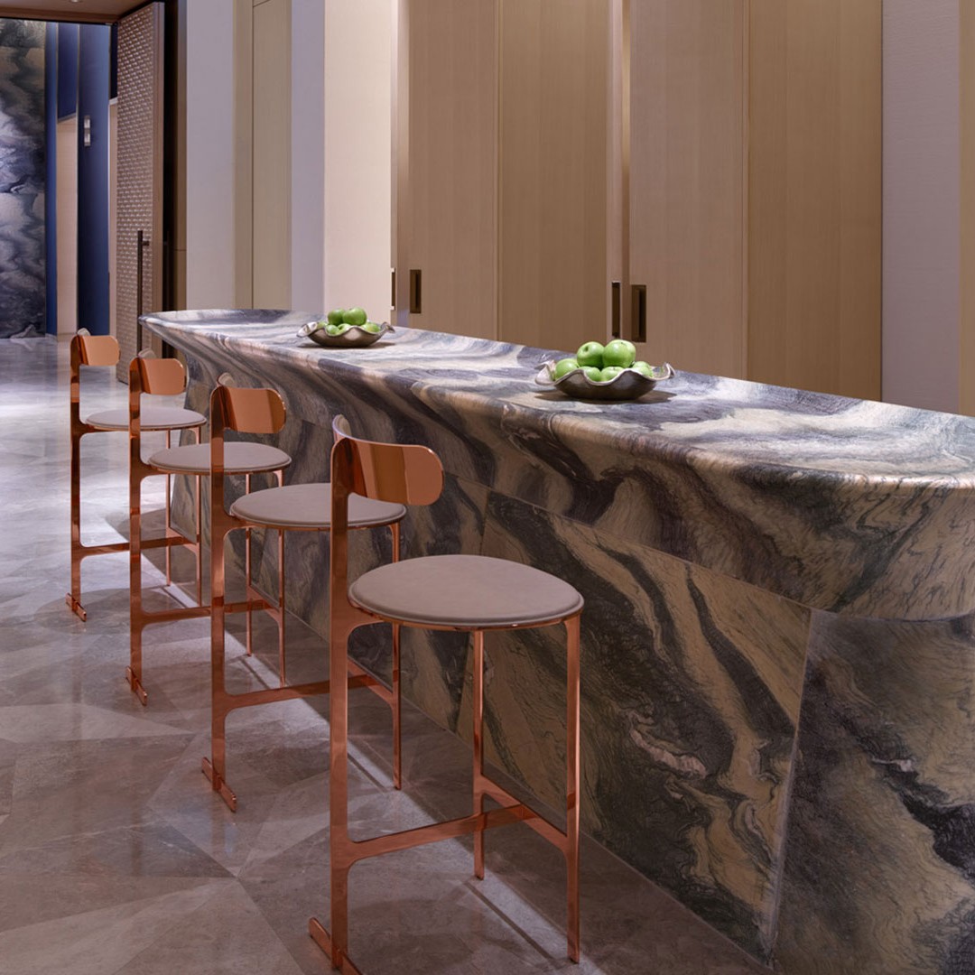 Park Place is in the heart of the most famous skyline in the world. The strong simple lines metal structure of the Park Place stools and chair by Yabu Pushelberg are reminiscent of the skyscrapers that tower above Manhattan.