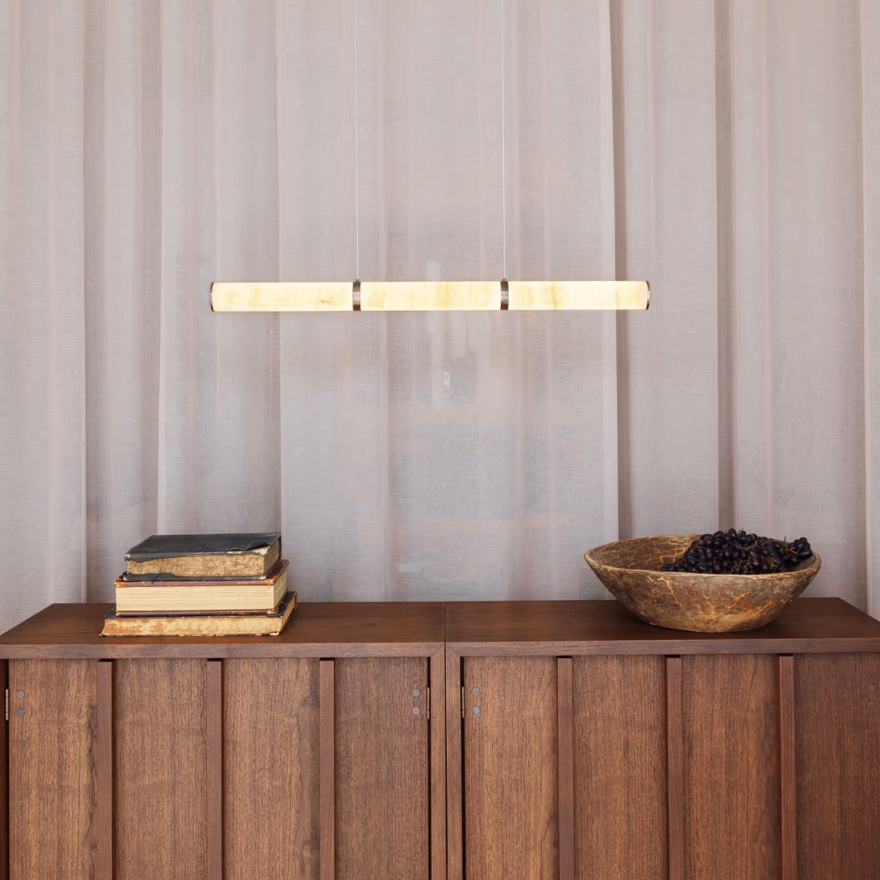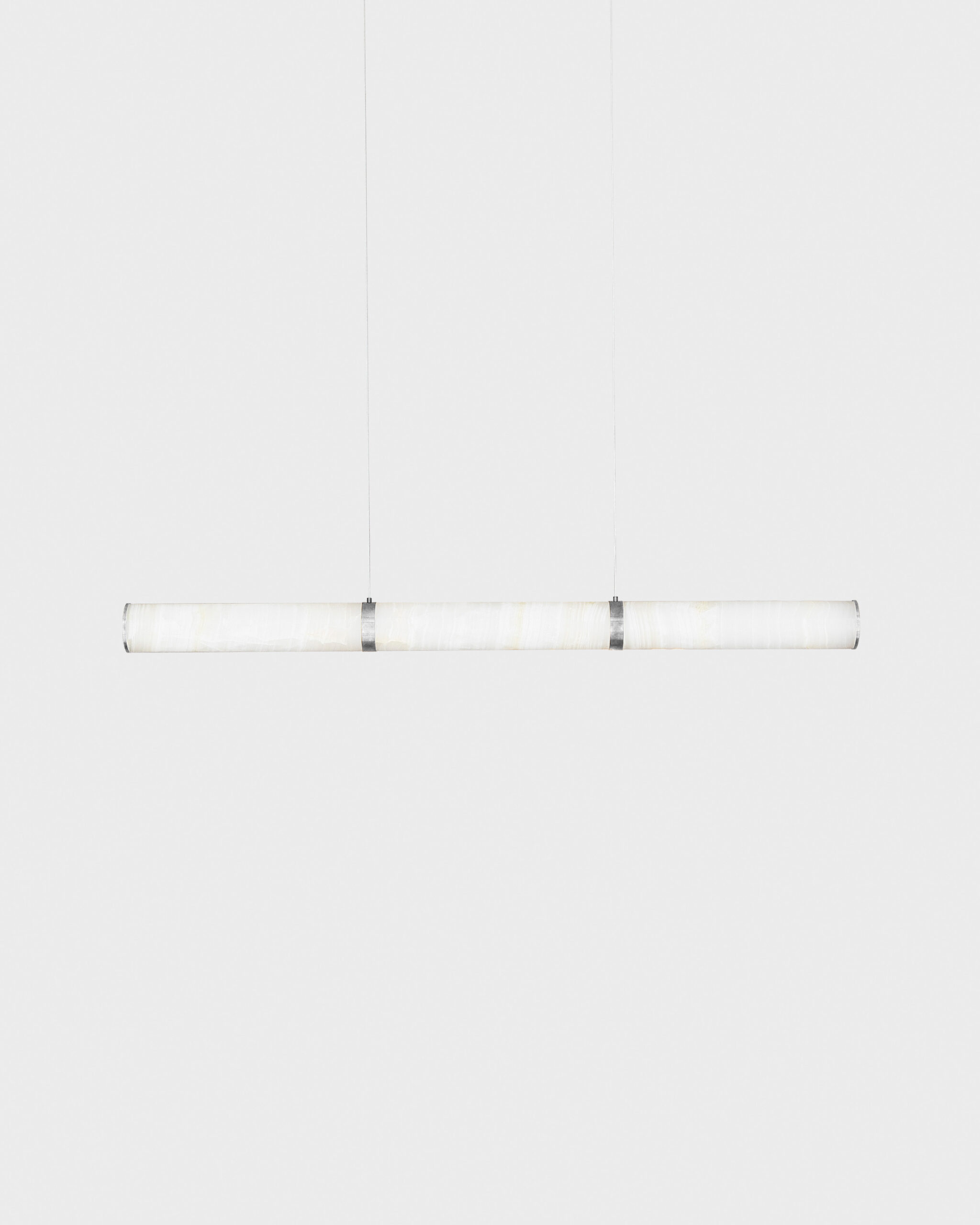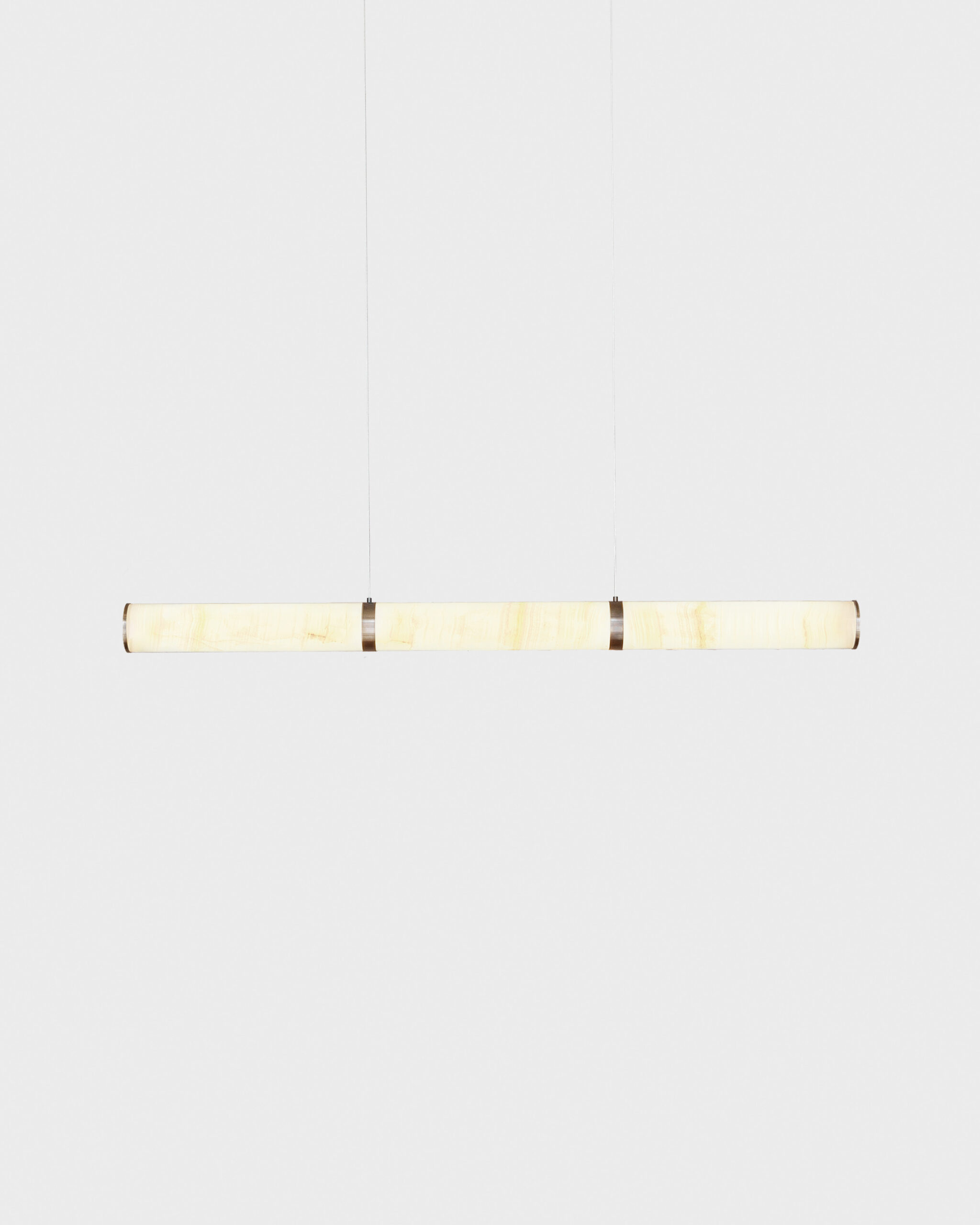 A linear pendant that frames space with calm precision. Suspended horizontally, PARS highlights dining tables, kitchen islands, or meeting areas with an understated graphic gesture. The onyx shades cast a soft, inviting glow, while the refined metal profile anchors the piece in contemporary architecture. A dialogue between line and volume, light and stone.