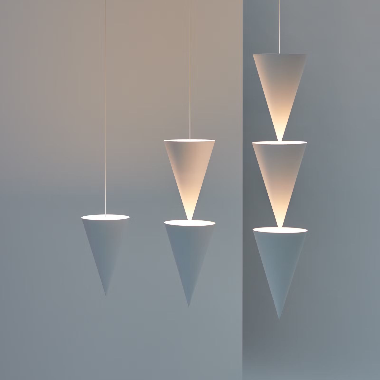 Peaks is a family of pendants, composed of a string of elongated cones in different configurations. The graded shading on the curved surface of each cone is as much of a feature as the projected beams emitted from each cone. It can be displayed as a single, double or triple arrangement, pointing up or down depending on the preferred direction of light. An identical inverted cone acts as a rose attached to the ceiling.