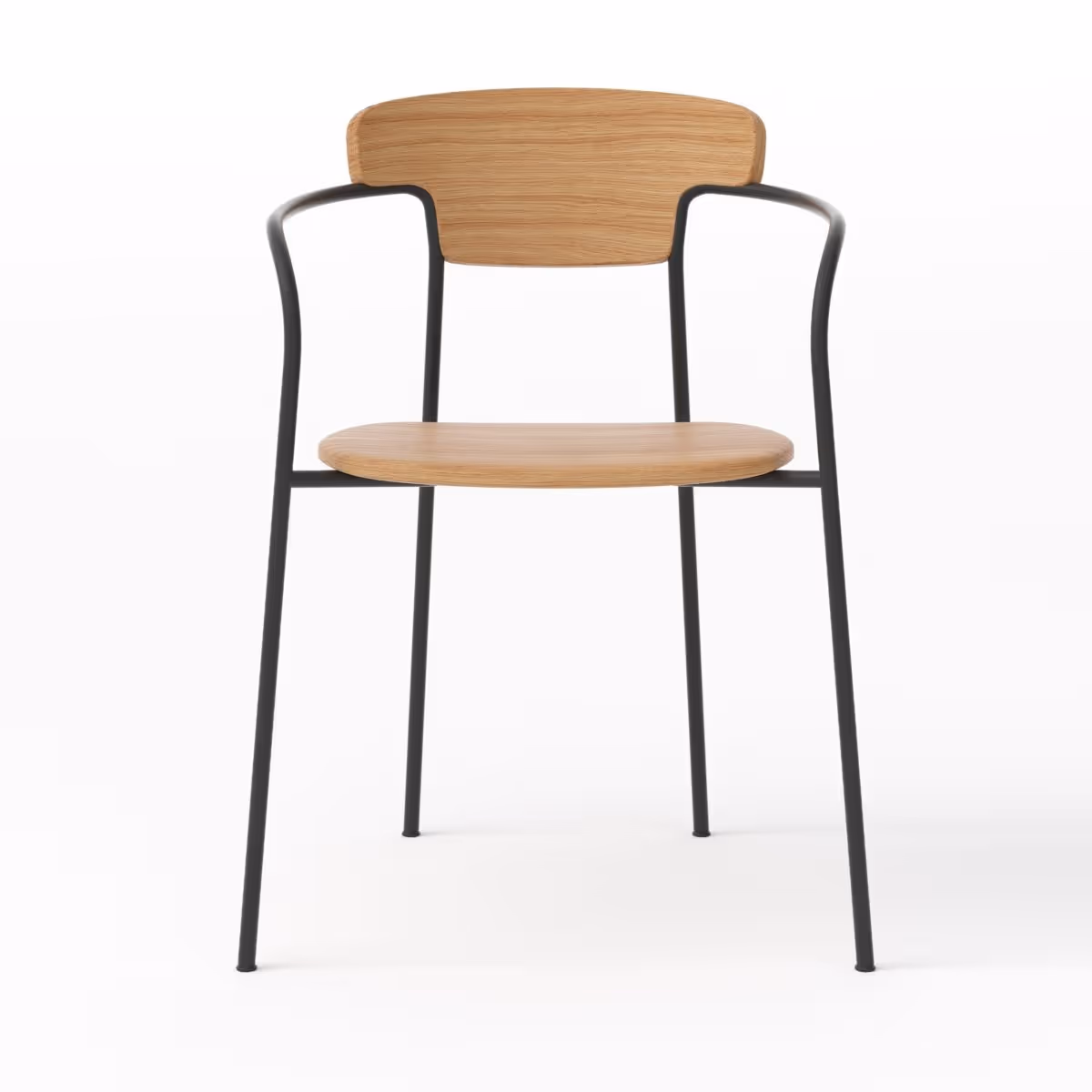 "A line of metal elegantly embraces the chair from the armrests and around the wooden backrest. The two oak elements (seat and backrest) contrast with the slender metal tube that characterises the silhouette of the design."
