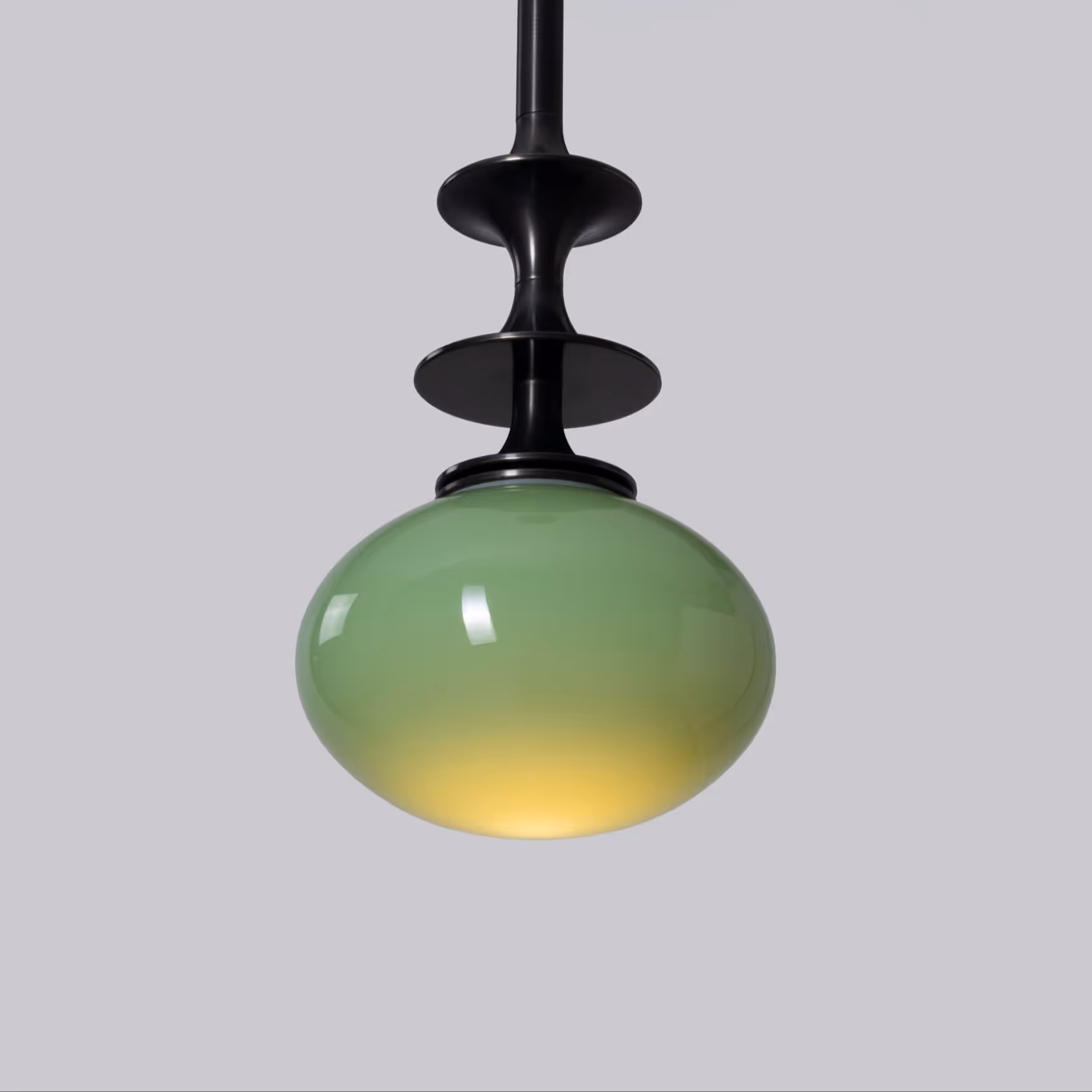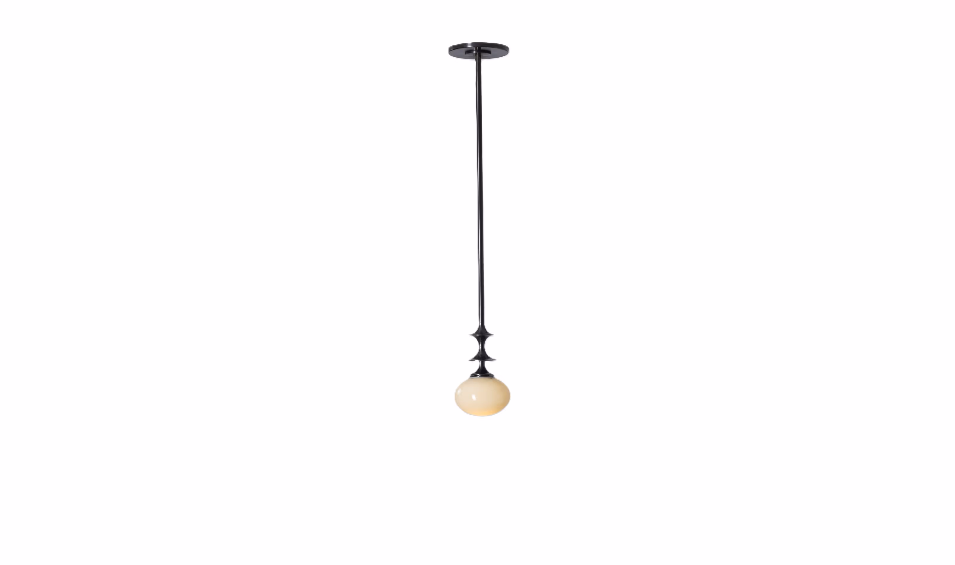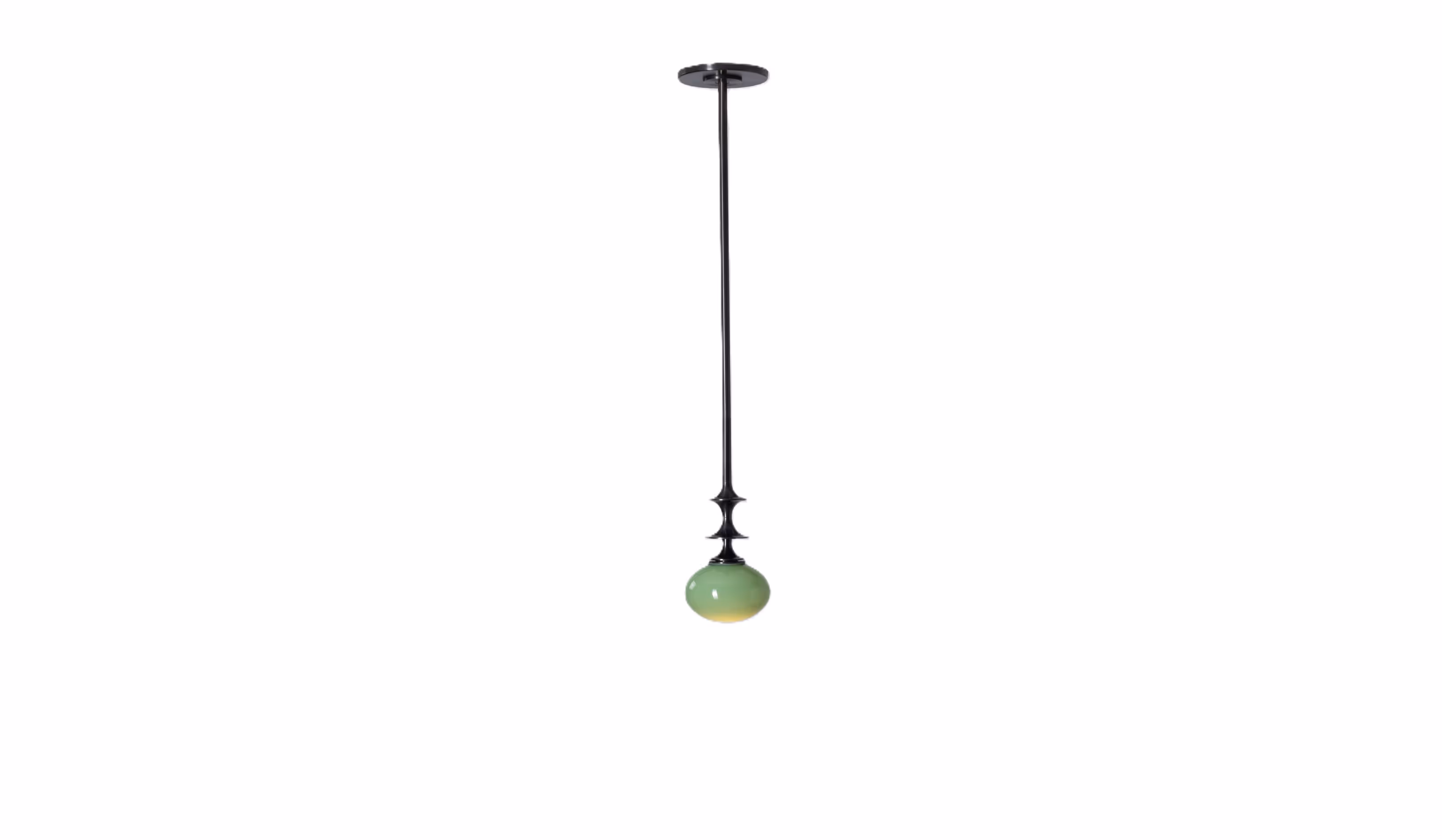 The designs of the Perla lighting series feature glowing ellipsoids of handblown glass with decorative brass hardware. The pendant stem transitions above the glass into a decorative metal profile. The Perla Pendant is simple and understated.