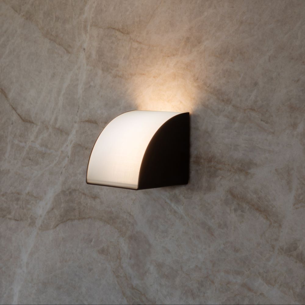 The dark bronze body is accompanied by a warm LED-lit acrylic diffuser, enhanced with a subtle linen-textured appearance. Its distinctive form gives the impression of a fraction of the crescent shape. When arranged in multiples, it offers a coordinated visual result.