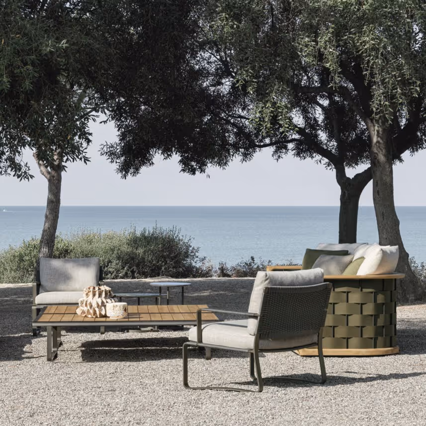 Both tables are available with tops in either teak slats or Etna lava stone with an enamelled finish in anthracite, olive green and desert yellow, which are common to the colours of the collection and the woven polypropylene rope. The vitreous inserts of the Etna lava stone, used for the oven-baked enamelling of the surfaces, come from the crushing of recycled glass from TV and PC monitors.