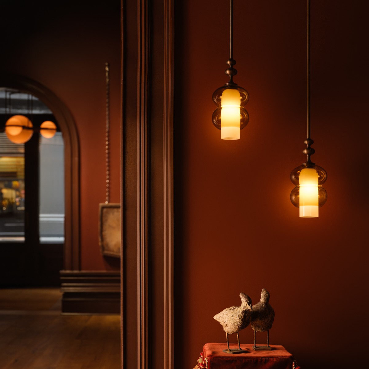 The pendant stem transitions above the glass into a decorative metal profile. Available in multiple profile options, glass color combinations, and brass hardware finishes. Part of the SkLO + AvroKO collection – a collaboration between SkLO and the AvroKO Partners.