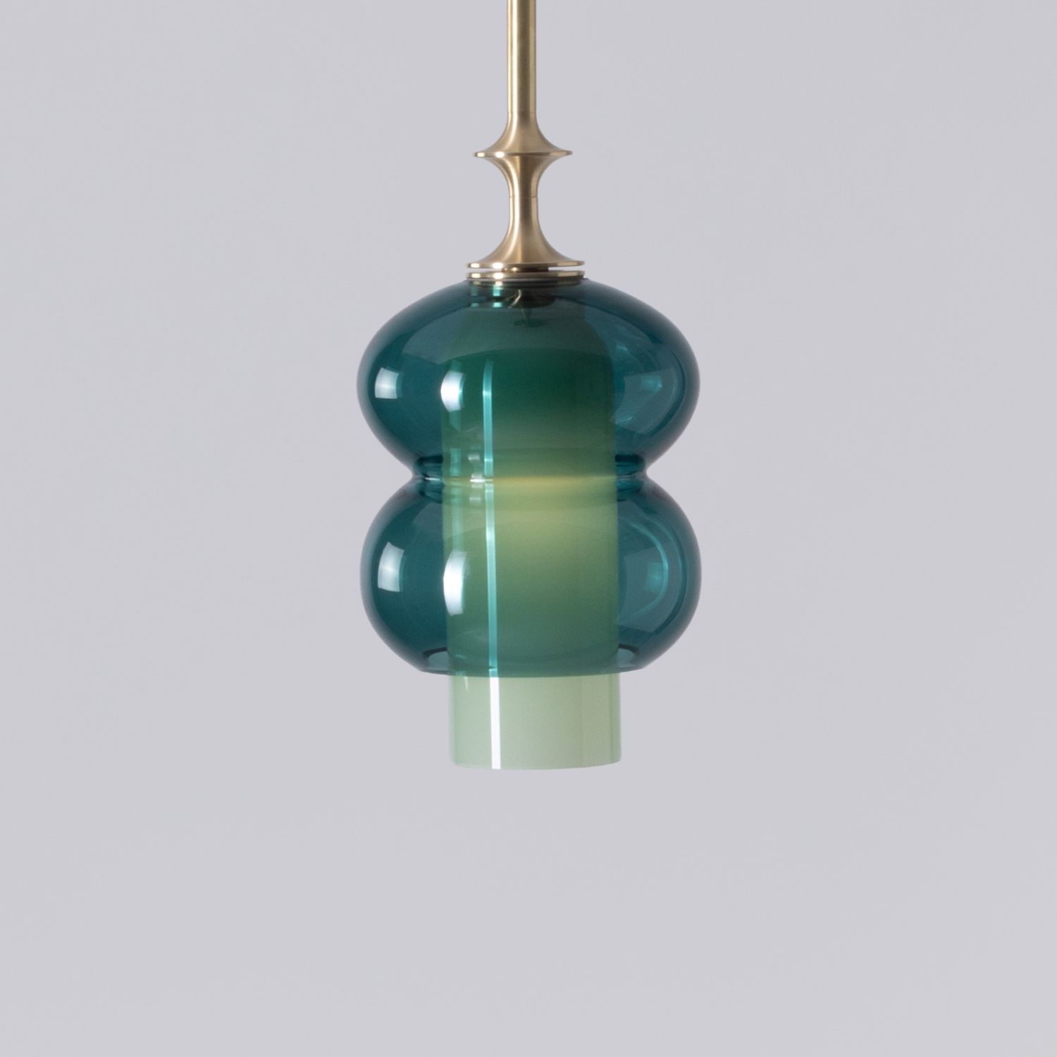 The Prince Pendant gets its look by layering shape, color, and transparency in handblown glass. A curvy double-ellipsoid outer glass diffuser is rendered in transparent colored glass, and it embraces an inner cylindrical diffuser of opaque glass. The opaque glass glows through the vibrant transparent glass. The effect is gorgeous and demure.
