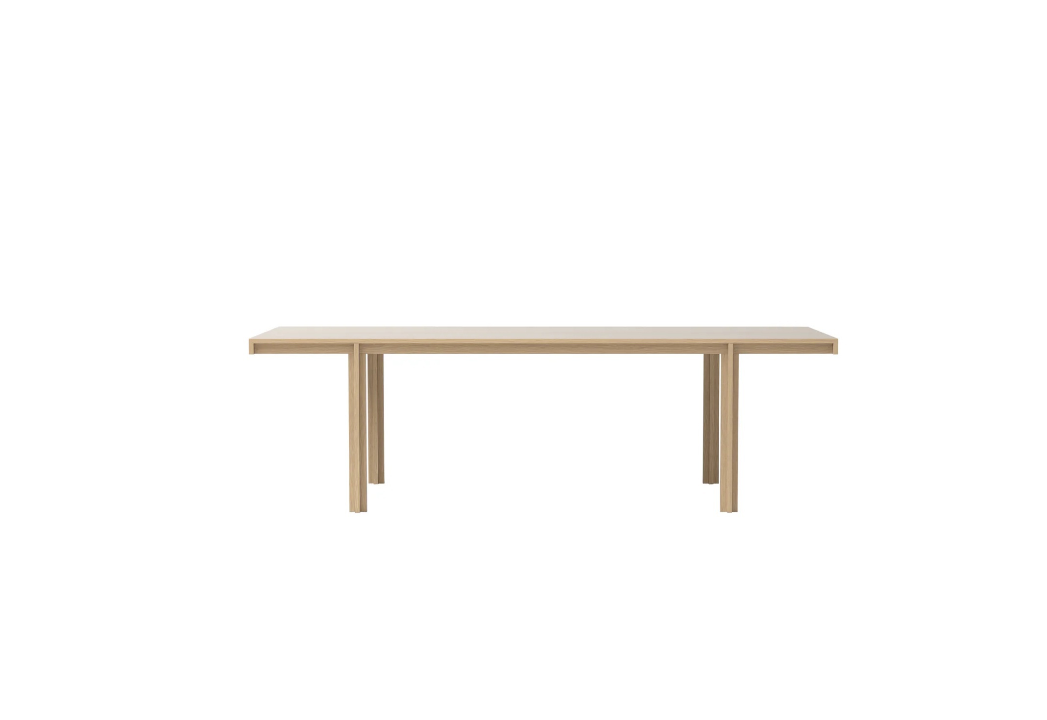 The solid wood dining table boasts a clarified form, repeating a simple angle throughout table legs and ends of the table top, while the dining chair with its circular seat and gently rounded backrest, beautifully upholstered, adds a softness to the clear, unfussed geometry, an invitation to linger.