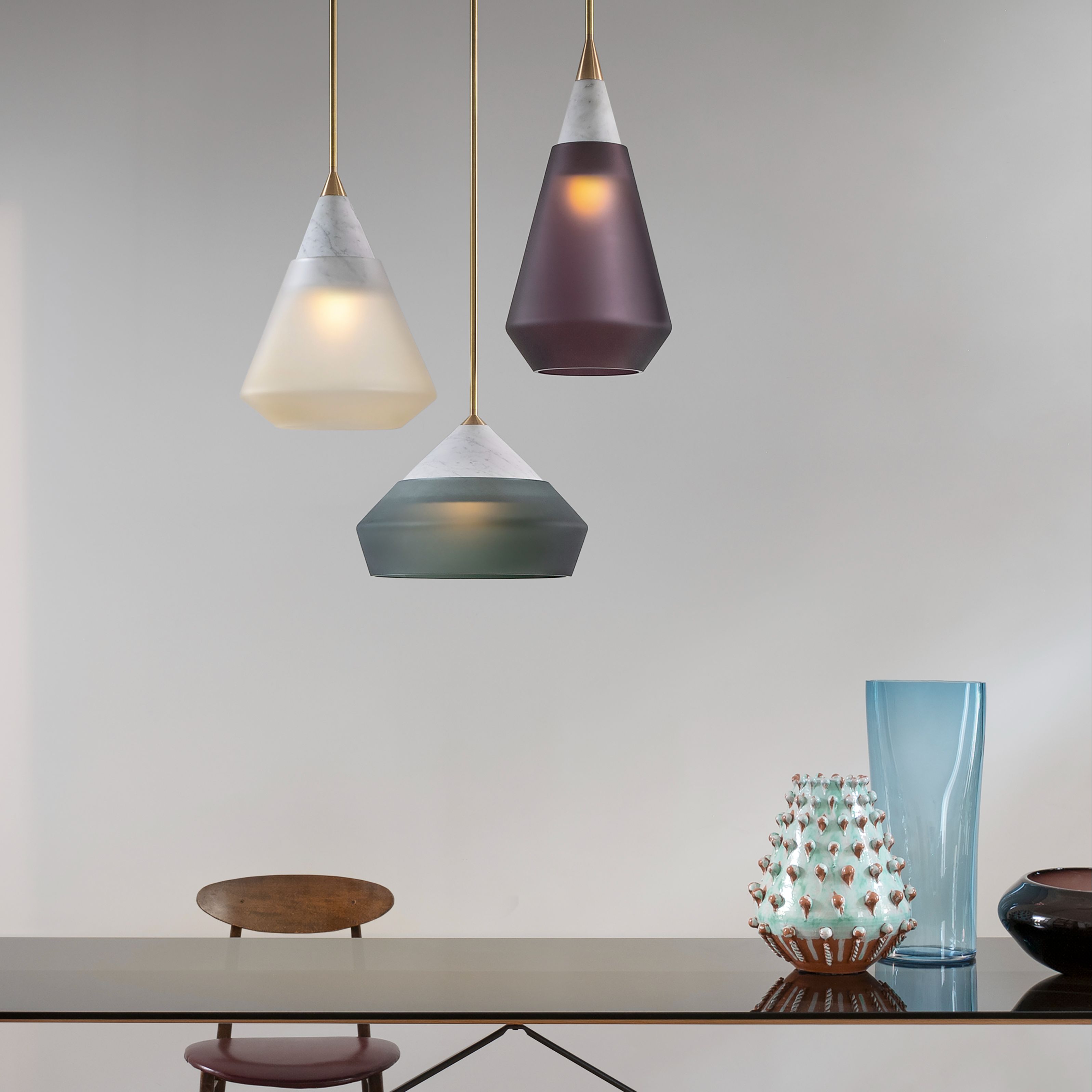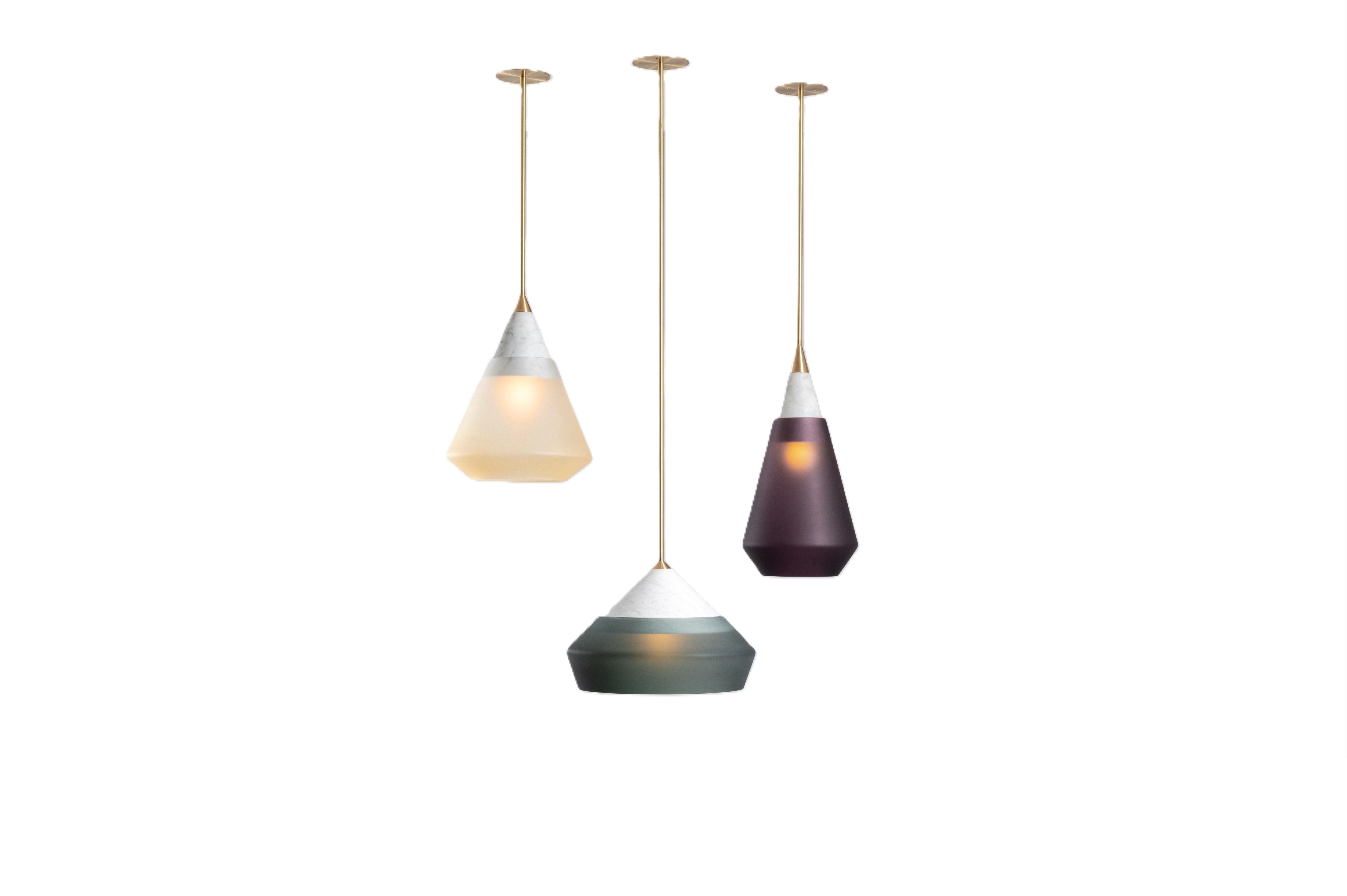 Rest Pendants are conical shapes of honed carrara marble that support frosted handblown glass shades. Each is topped with a custom brass finial and suspended on a rigid brass stem. The glass shades have an angular geometry that bevels inward at the bottom. The three unique shapes have different proportions and angles, yet all share the same language, making them natural partners when used in groups within the same space.