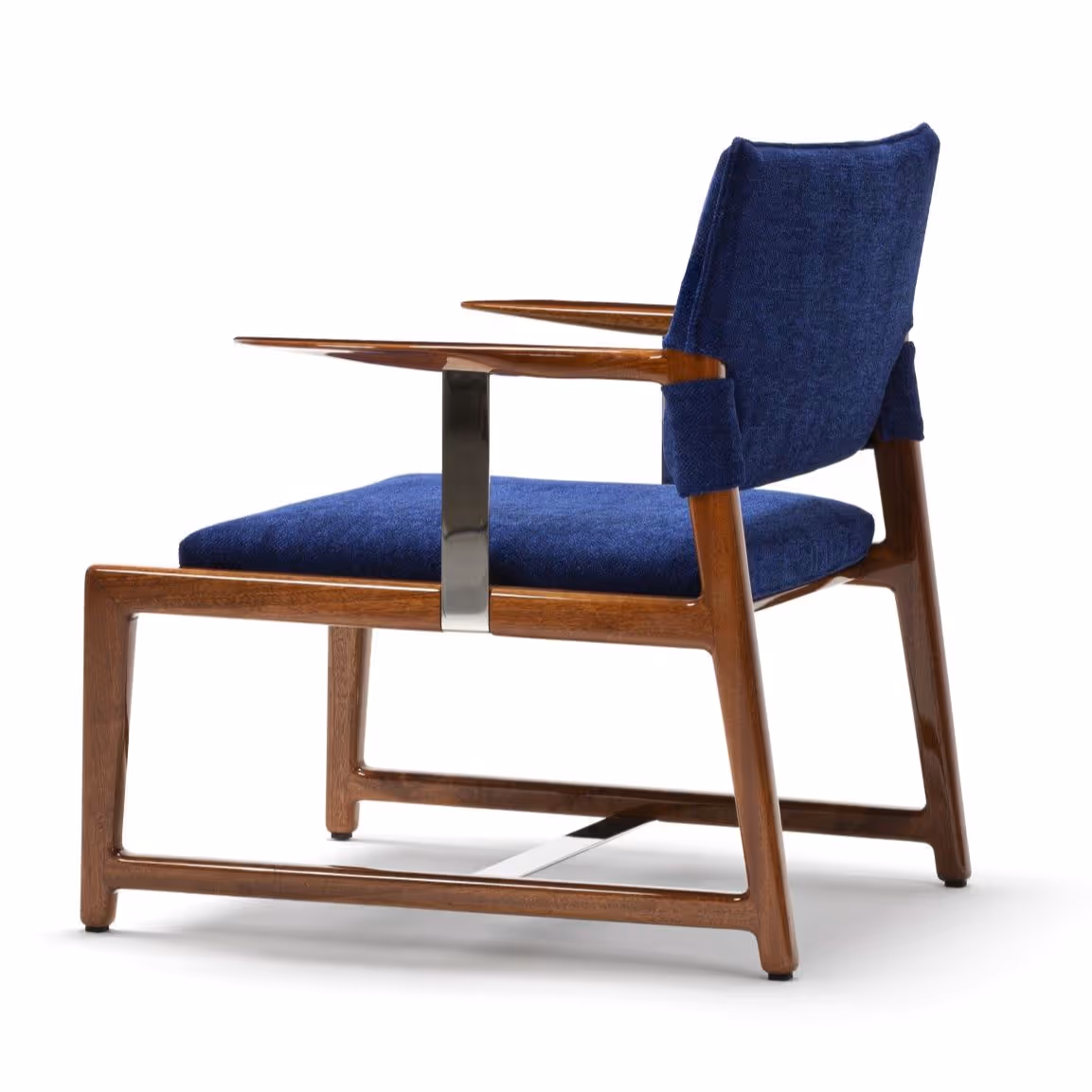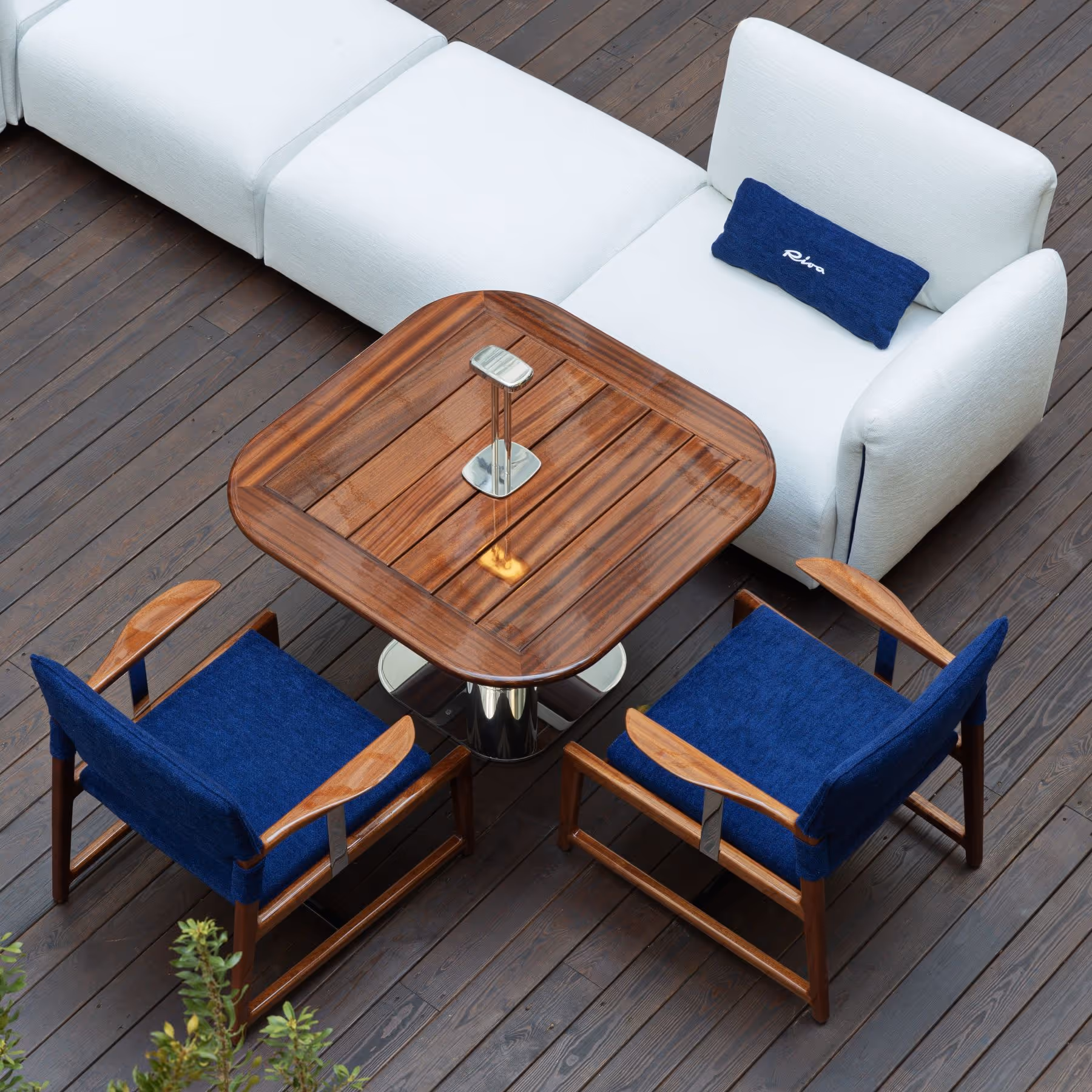 Made of stainless steel and mahogany, the Exteta x Riva Armchair evokes marine elegance with low, wide lines. Its refined mix of wood warmth and metal clarity recalls life on board, uniting durability, precision, and timeless design.