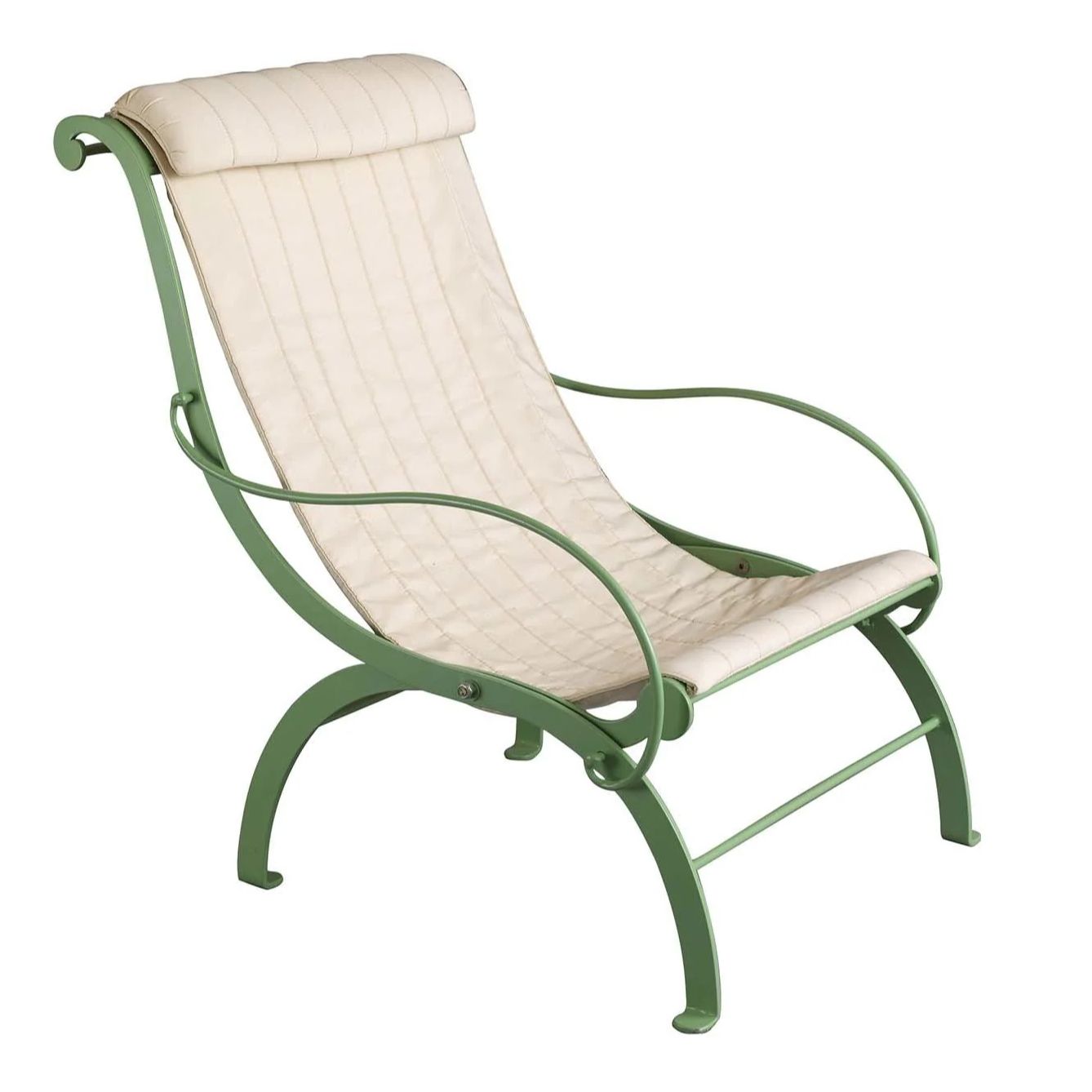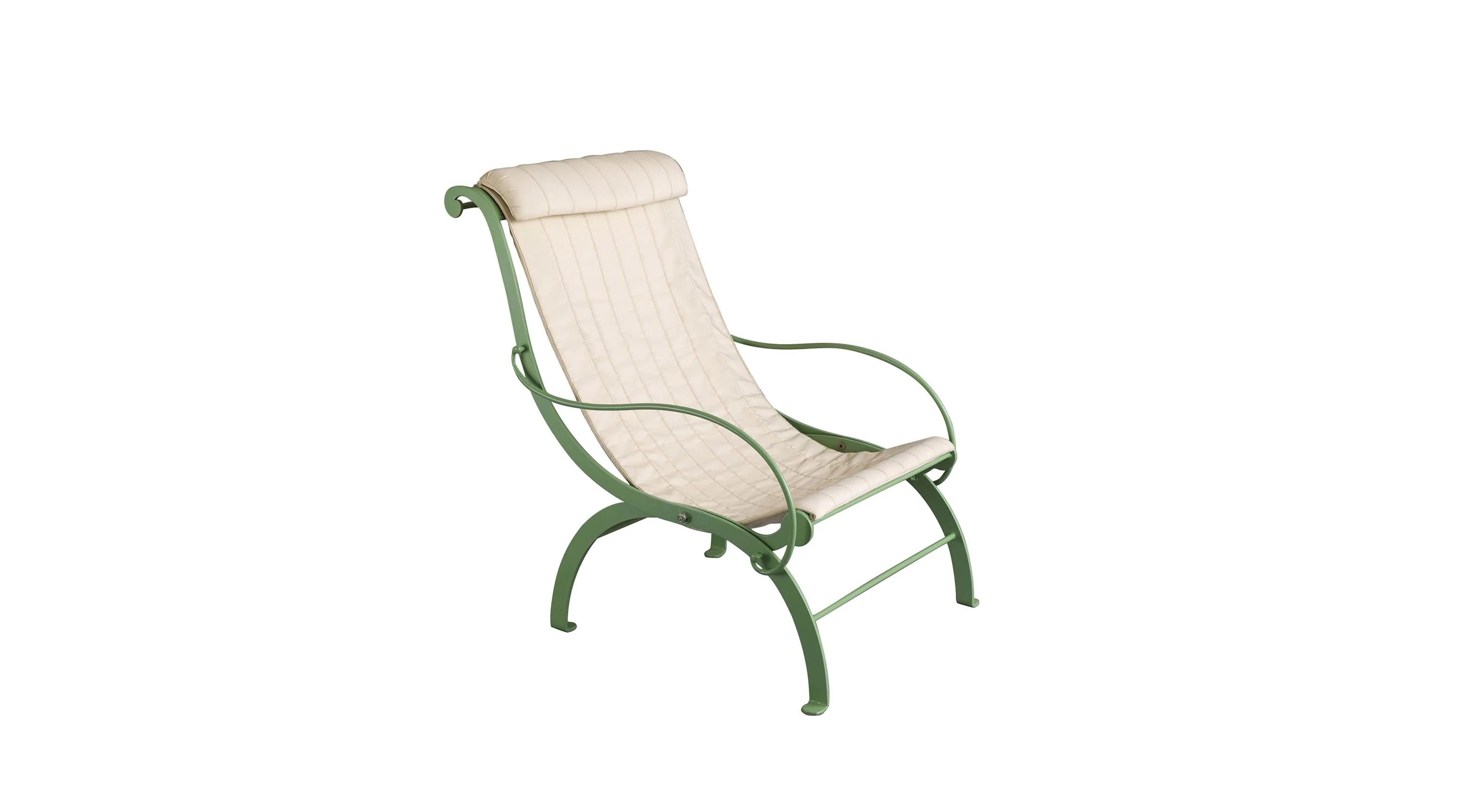 The elegant design of this armchair allows to comfortably lean back and relax in an outdoor space. The forged stainless steel structure is foldable, allowing for easy storage during inclement weather. Distinctive for its curved lines inspired by traditional silhouettes interpreted with modern sensibility, this chair is treated with zinc and varnished with powder while the padded headrest cushion is upholstered with outdoor fabric.