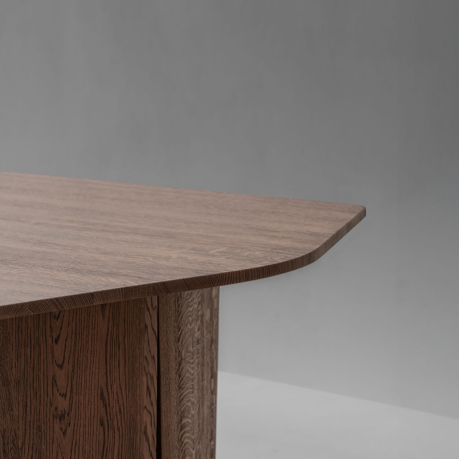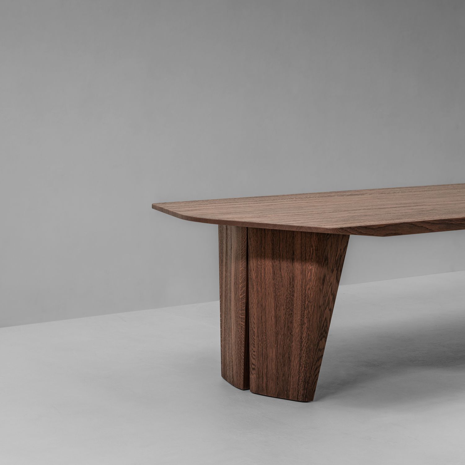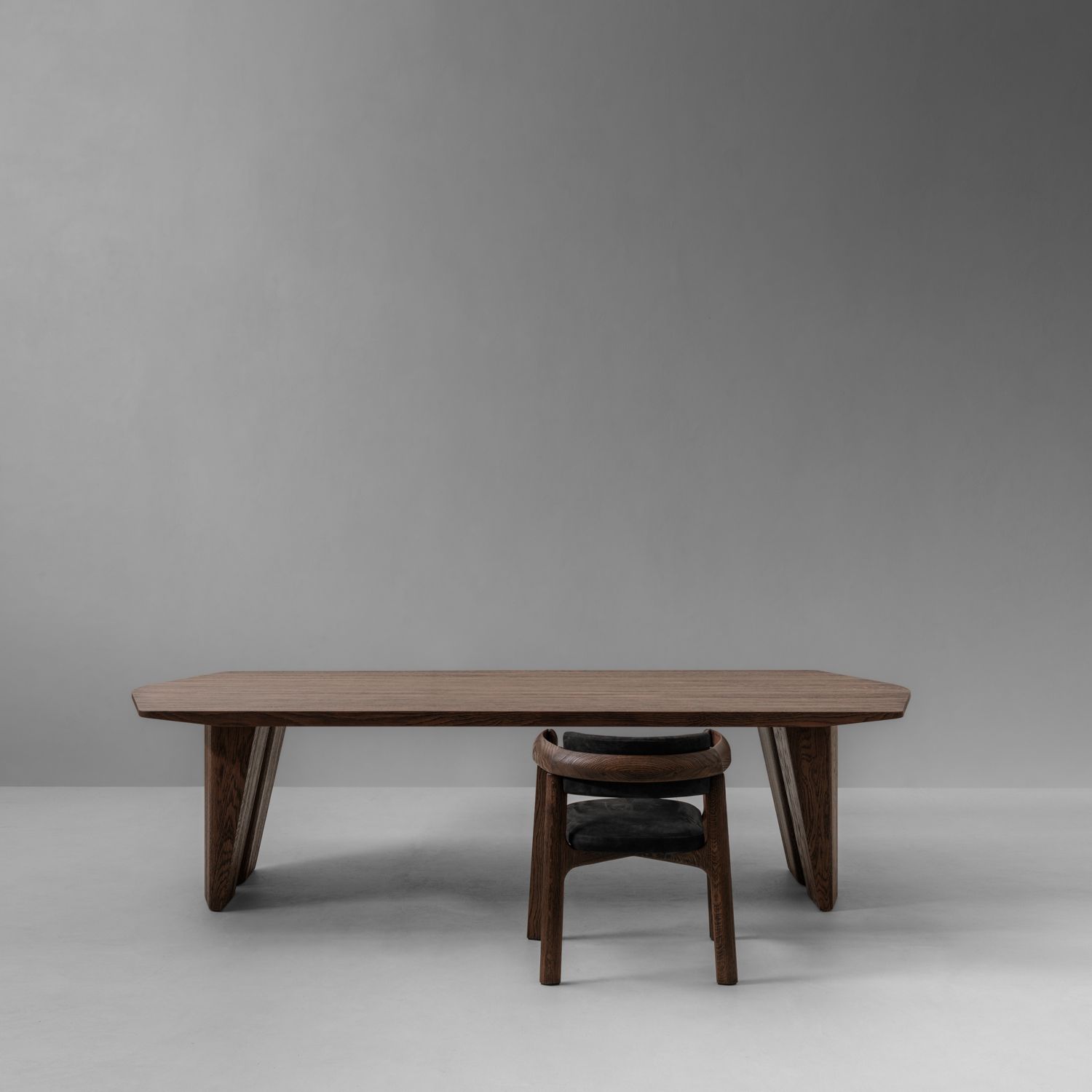 A dining table crafted from solid wood, featuring an elongated top with a gentle chamfer that tapers toward the edge. Two sculptural pedestal bases, split through the center, ground the form with quiet strength.