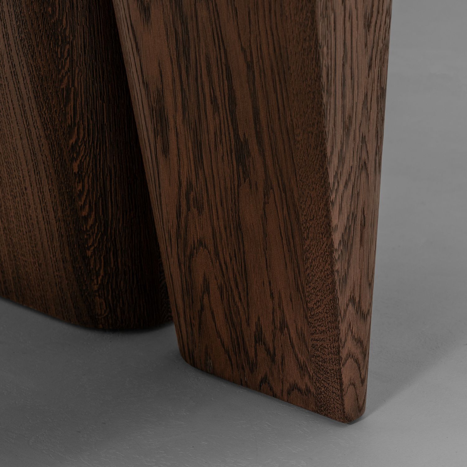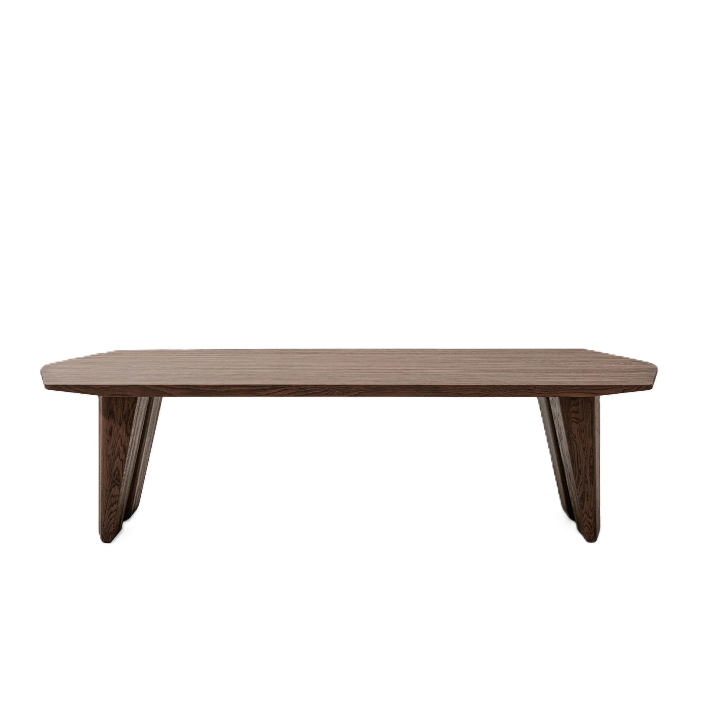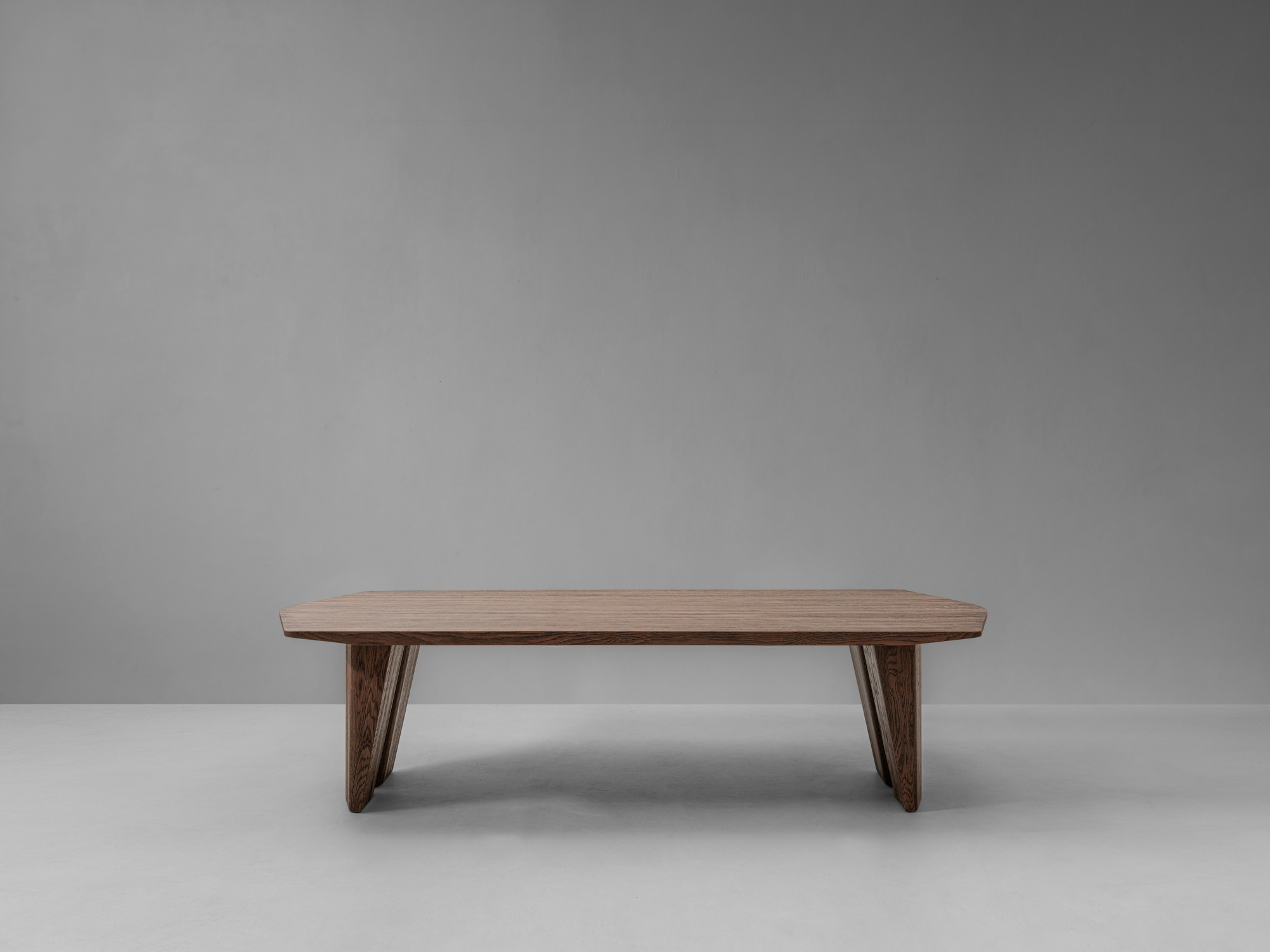 A dining table crafted from solid wood, featuring an elongated top with a gentle chamfer that tapers toward the edge. Two sculptural pedestal bases, split through the center, ground the form with quiet strength.