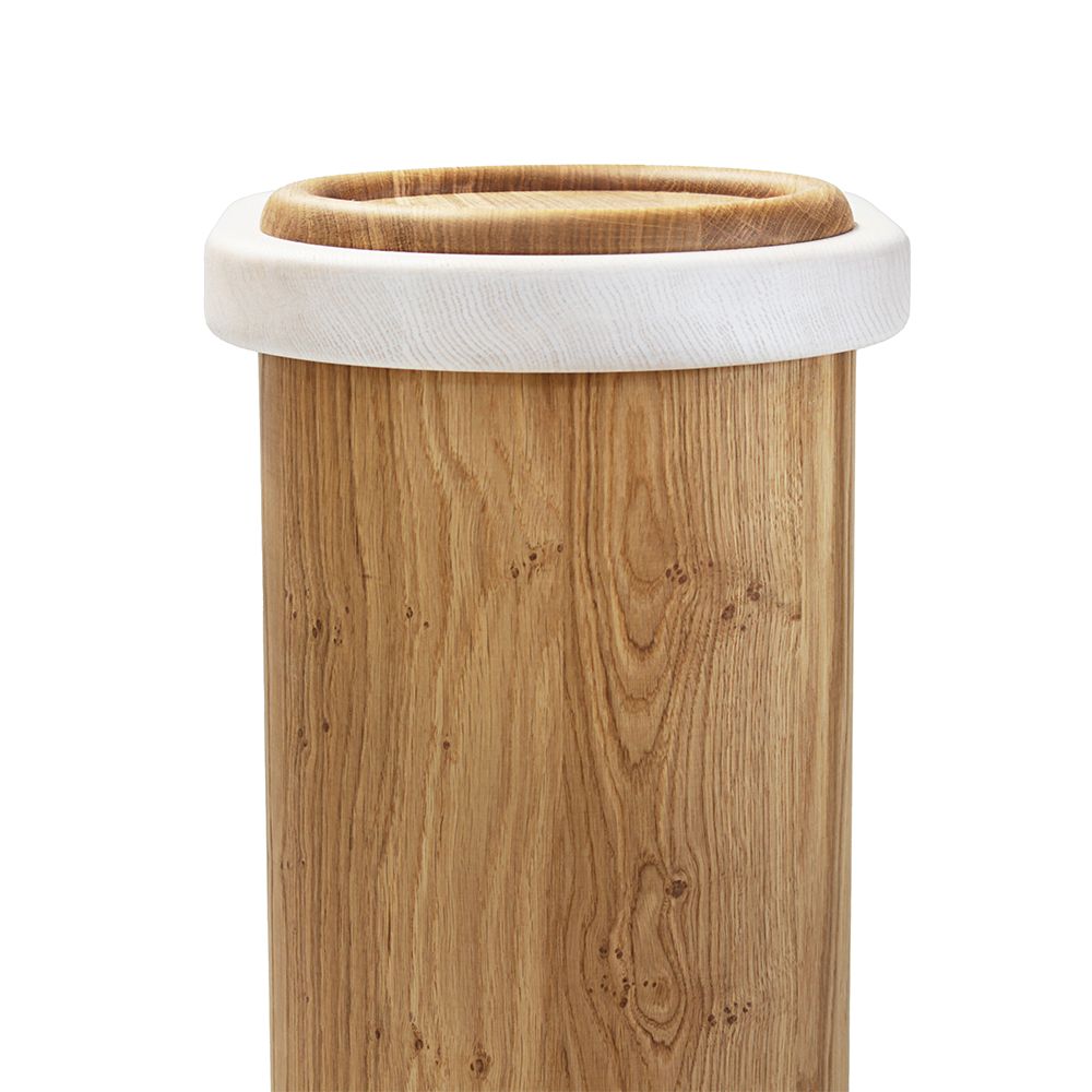The design features a soft, sculptural silhouette with rounded forms and a smooth transition between materials. Crafted in solid oak, each table is topped with a delicately whitewashed edge that accentuates its fluid curves and highlights the natural wood grain.