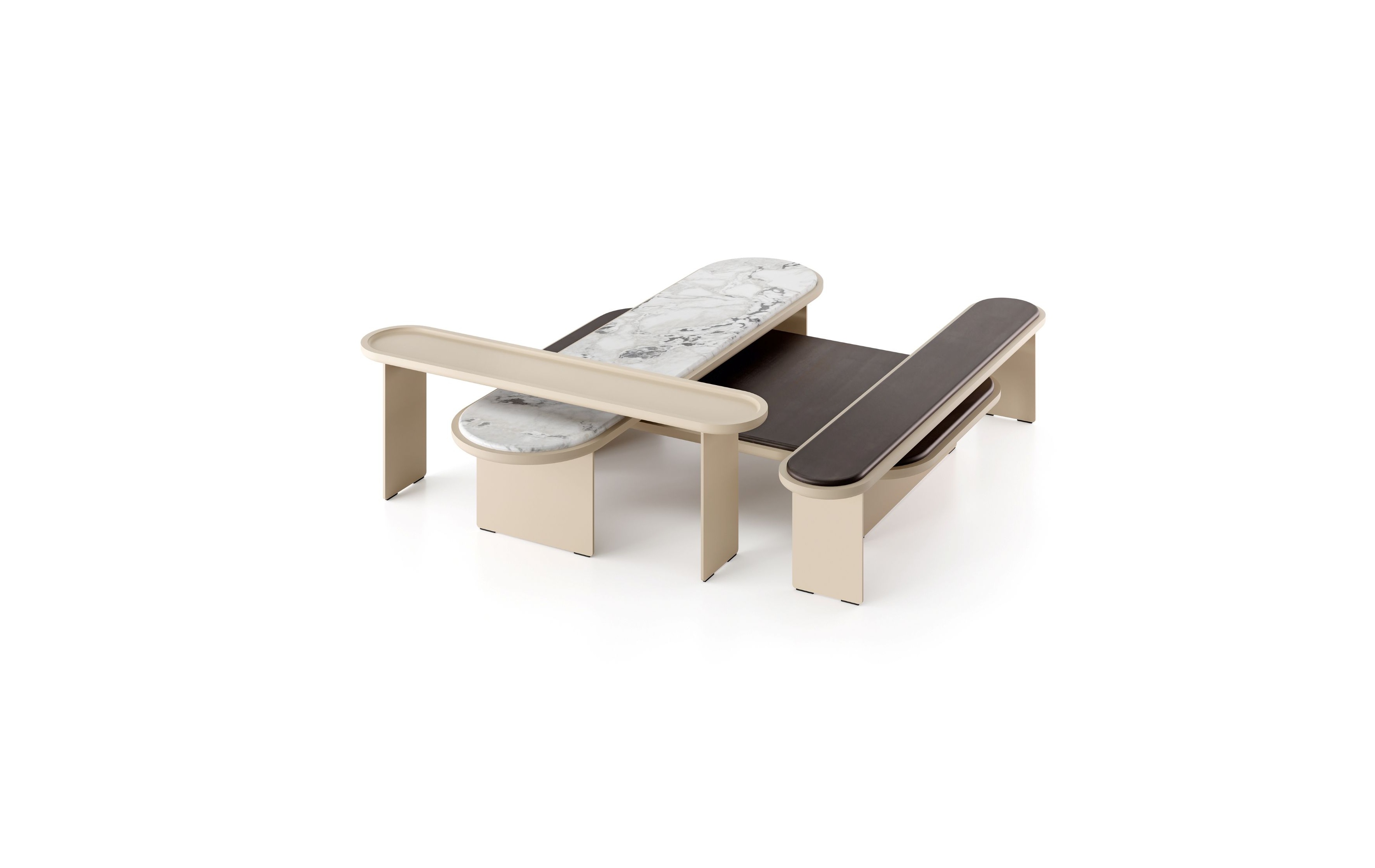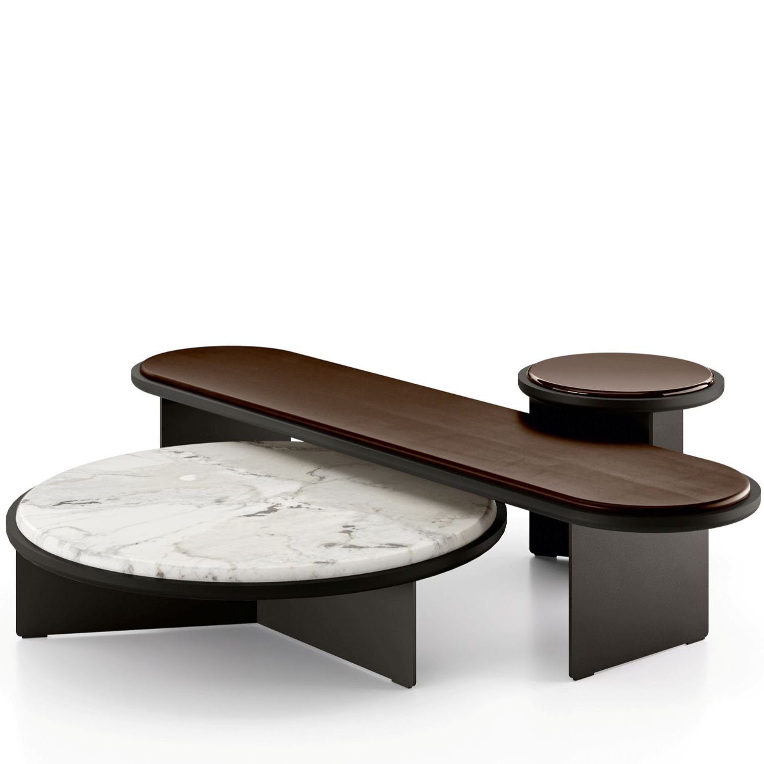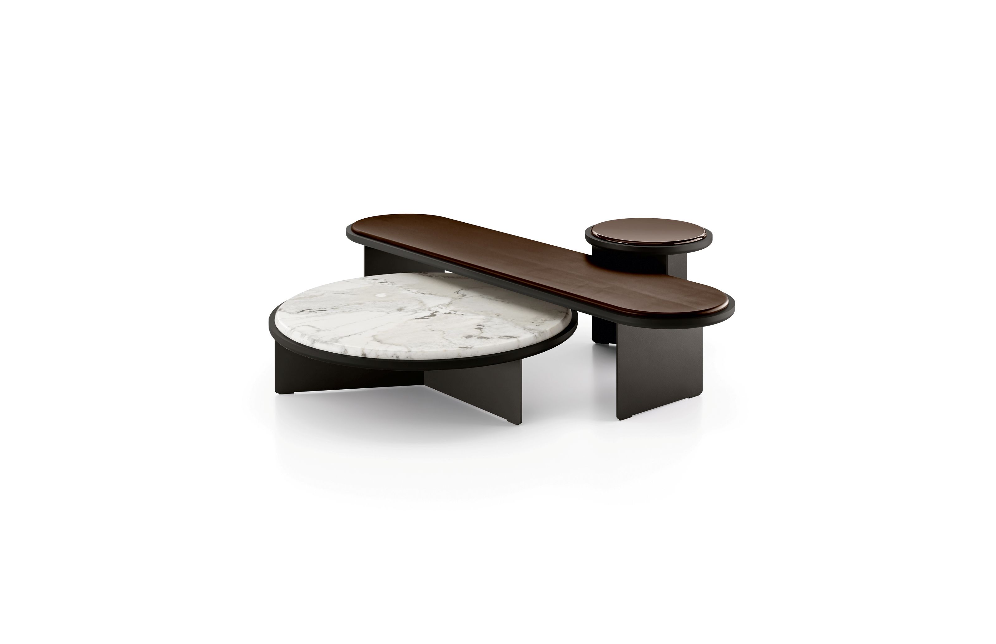 Coffee table with “deep black” lacquered metal structure and wooden top. Resting on the wooden top, 12mm glass top with half bull-nose grinding in the exclusive finish “Rosso Marte” or painted as per samples in the bright version. Also available with 20mm natural polished Calacatta Vagli Oro marble, brushed Ceppo di Gré®, satin Arabescato Orobico Rosso, satin Bianco Carrara Gioia or satin Dover White. The coffee table A is made exclusively with recessed wooden top.