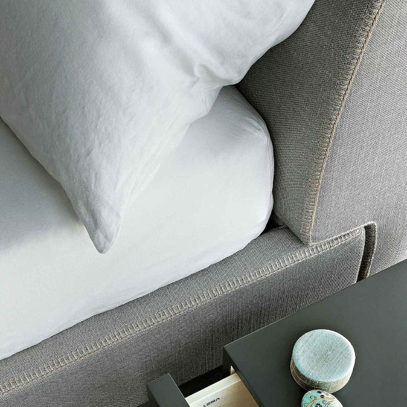 There is a linear design to the Softland double bed by Ludovica & Roberto Palomba, with its padded structure with removable cover in leather or fabric. The profile is emphasised by contrast blanket stitching, a sophisticated detail which underlines the shaping.
