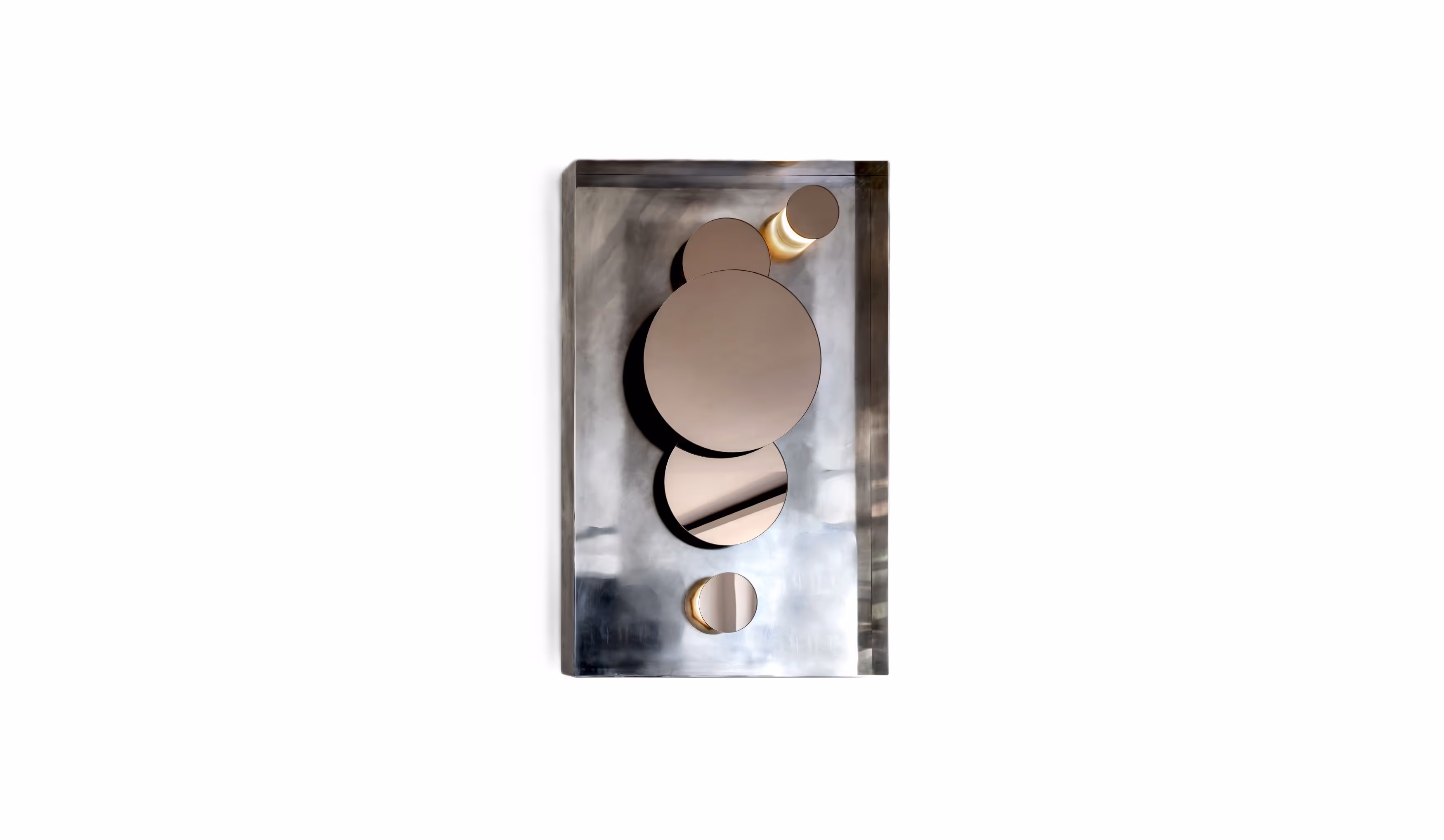 Radiating charismatic luminosity, the Solar mirror is a planetary constellation of rim lit mirror discs mounted on an etched brass base. Seen from different angles, the mirrors create a series of dimensional haloes and eclipses that appear to orbit one another in rotation like our solar system.