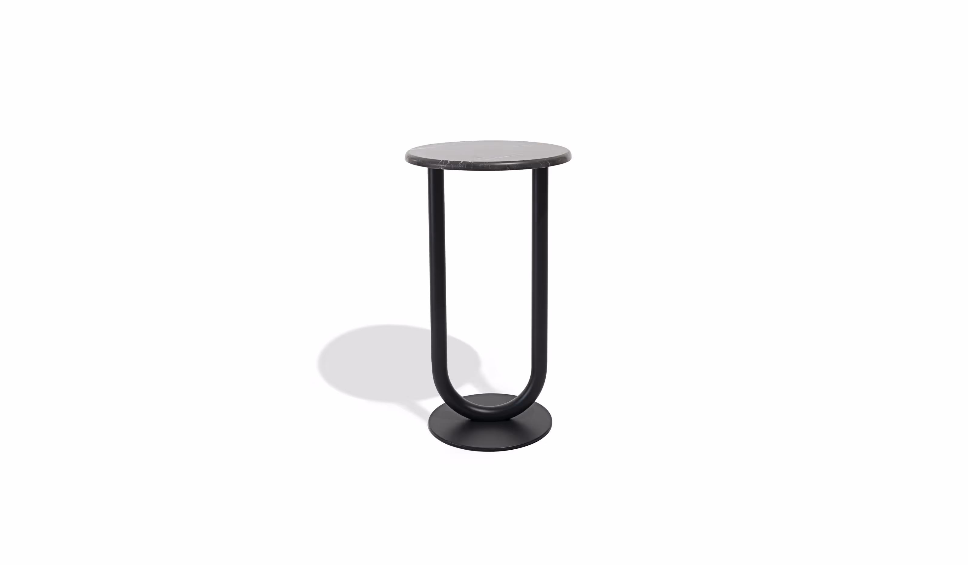 Structure in three heights (74 / 90 / 105 cm) in Ø60 mm curved tubular steel, with top in shaped steel sheet or marble. Version with top in sheet metal and marble, suitable for outdoor use.