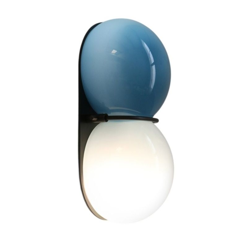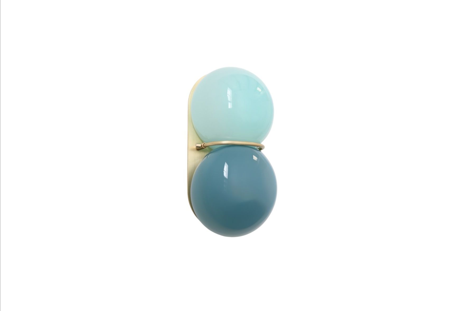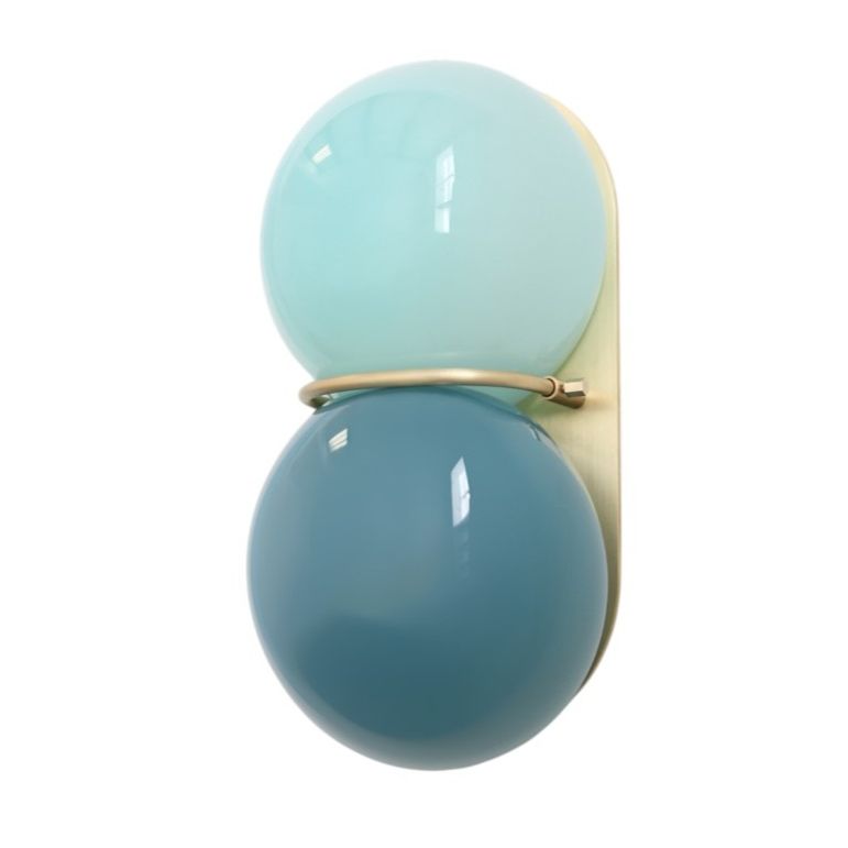 The Twin 1.0 Sconce features a two-tone diffuser of handblown Czech glass made up of two flattened spherical shapes in two colors which are melded together while hot on the glass blowing pipe. The glass is held to a solid brass plate canopy by a brass band that sits between the two spheres.