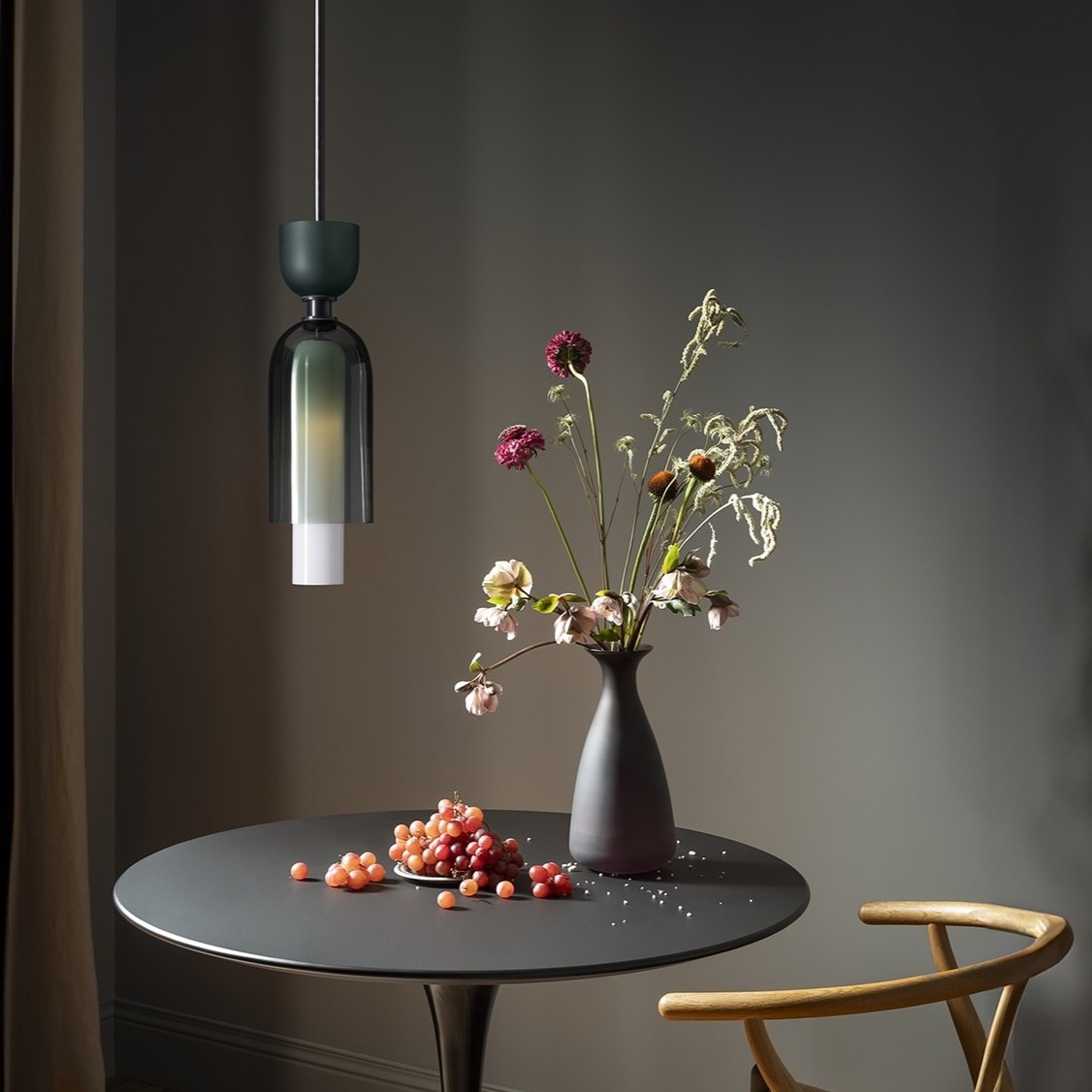 The designs of the Union lighting series combine upward- and downward-oriented glass dome shapes of different proportions in carefully curated palettes that mix color, transparency, and texture. The Union Pendant is the largest of the series, composed of three different glass colors and textures. The lower part of the pendant houses its light source within a long, narrow, opaque glass dome, which is itself enclosed within a larger transparent glass dome. Above the detailed brass hardware transition sits a smaller, upward-facing dome of frosted glass.