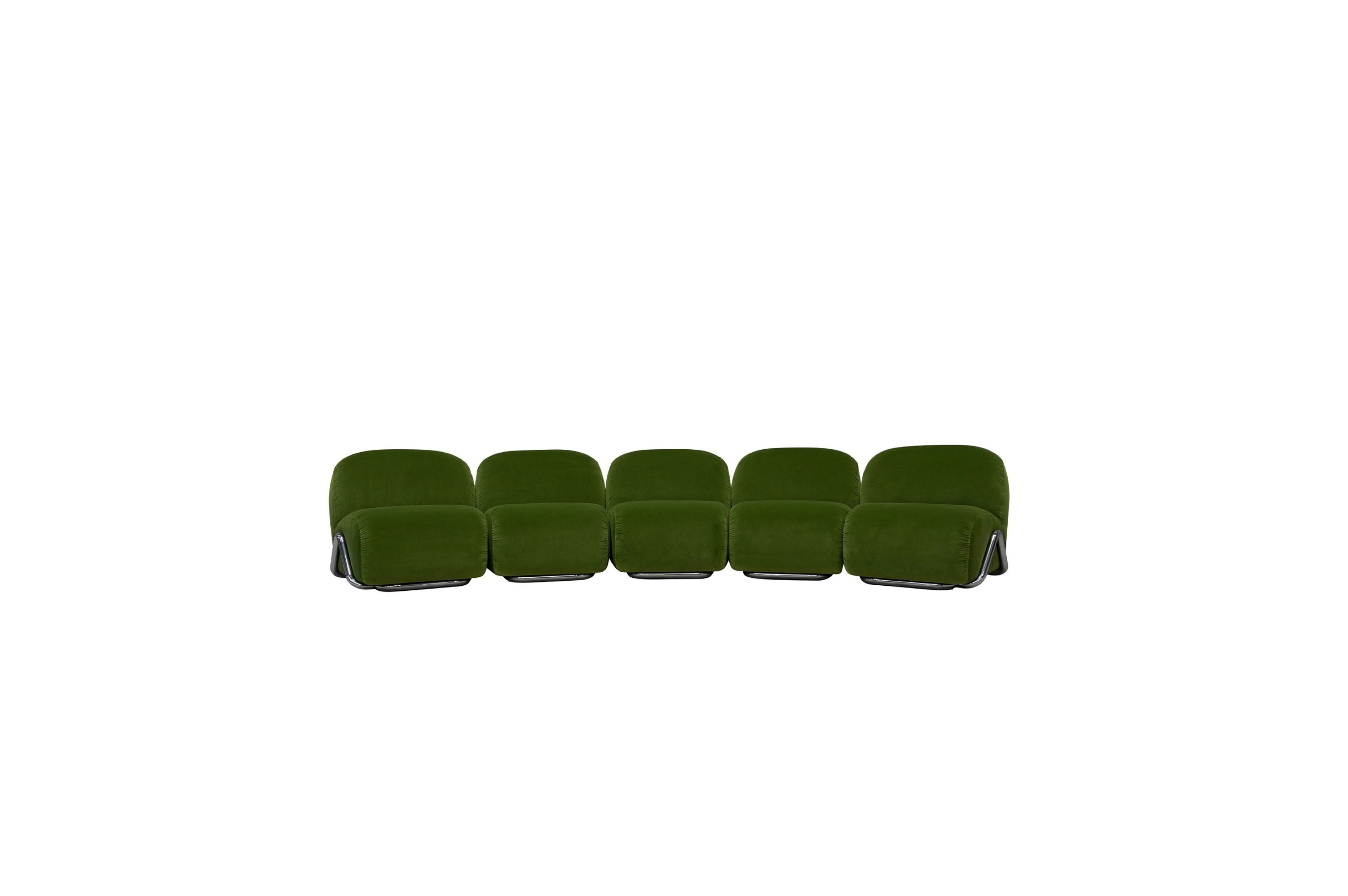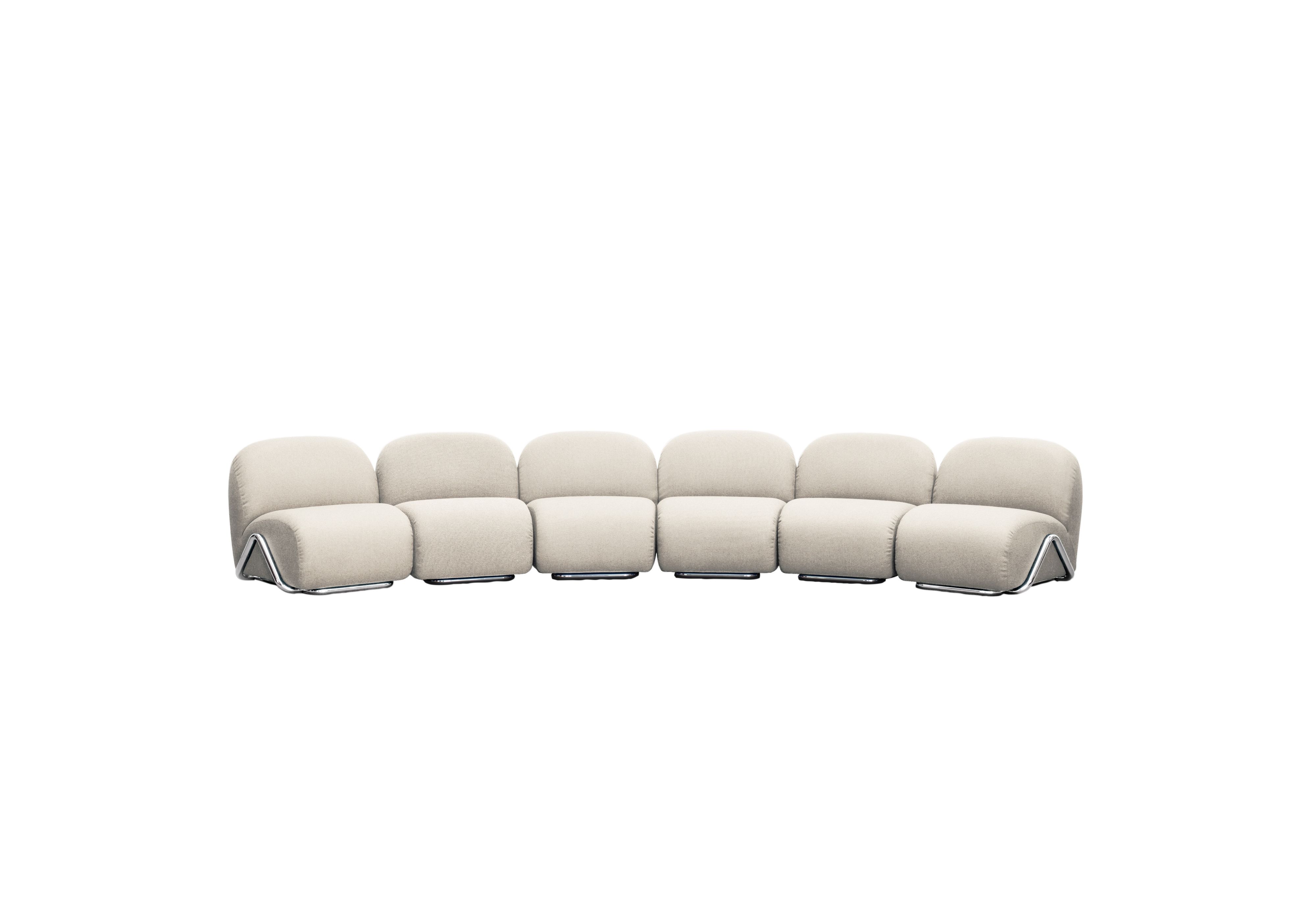 Lebanese design duo David/Nicolas are behind this modular system comprising armchairs, corner sofas, chaises longues and ottomans offering luxurious comfort. A tubular supporting frame – available in polished chrome, matt black chrome and black lacquer – serves as the product’s base, giving it a floating appearance and creating a sort of crown at the back.