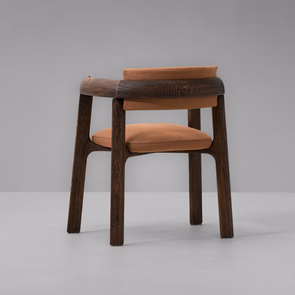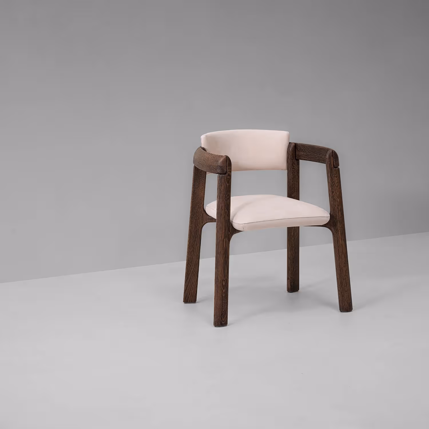 A sculptural chair with smooth, rounded lines, a gently curving backrest and slightly angled legs for stability, all while its organic form invites ease. Available in French oak and walnut, with or without armrest, and with your preferred covering from our collection of fabrics and leathers.
